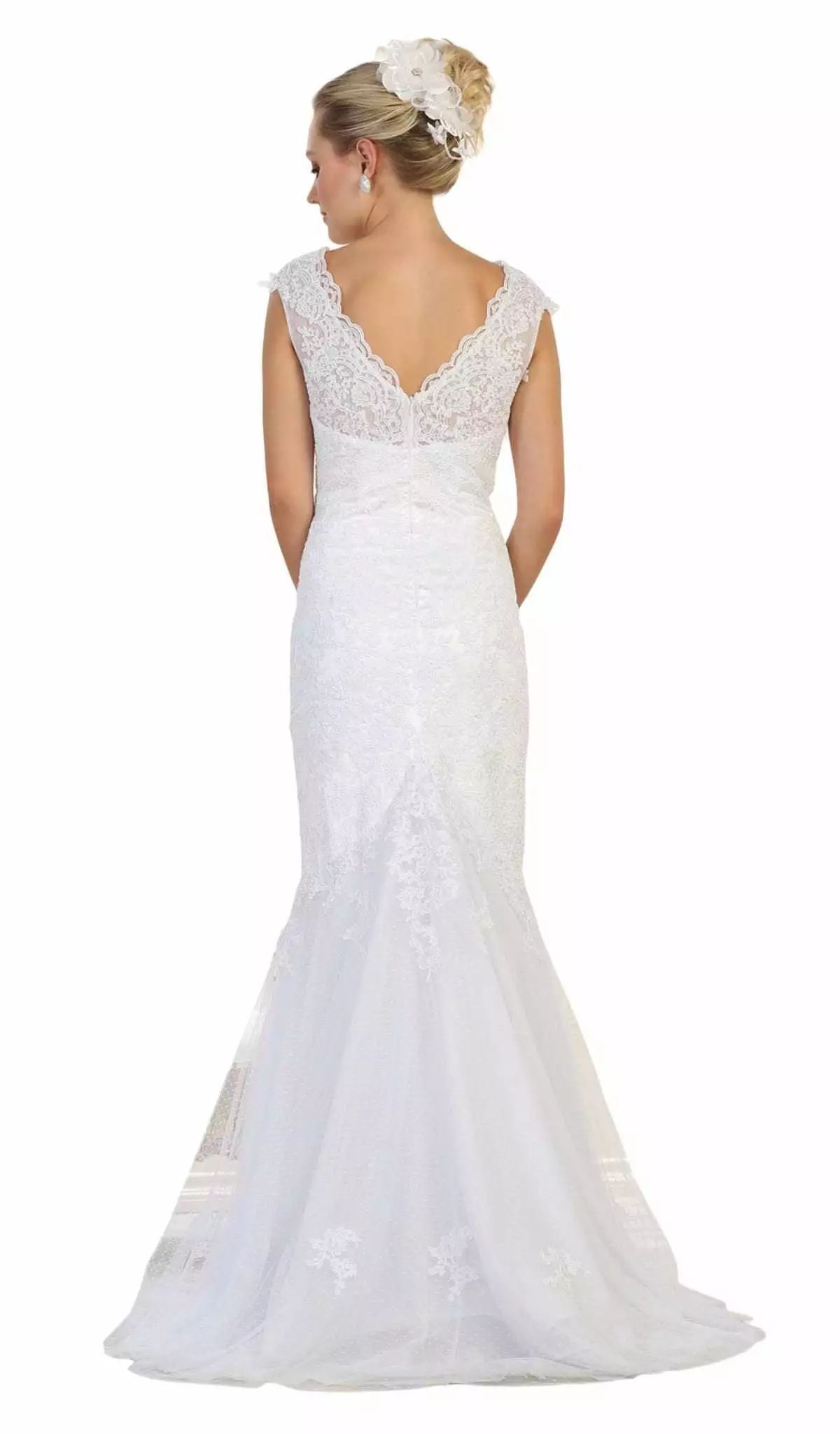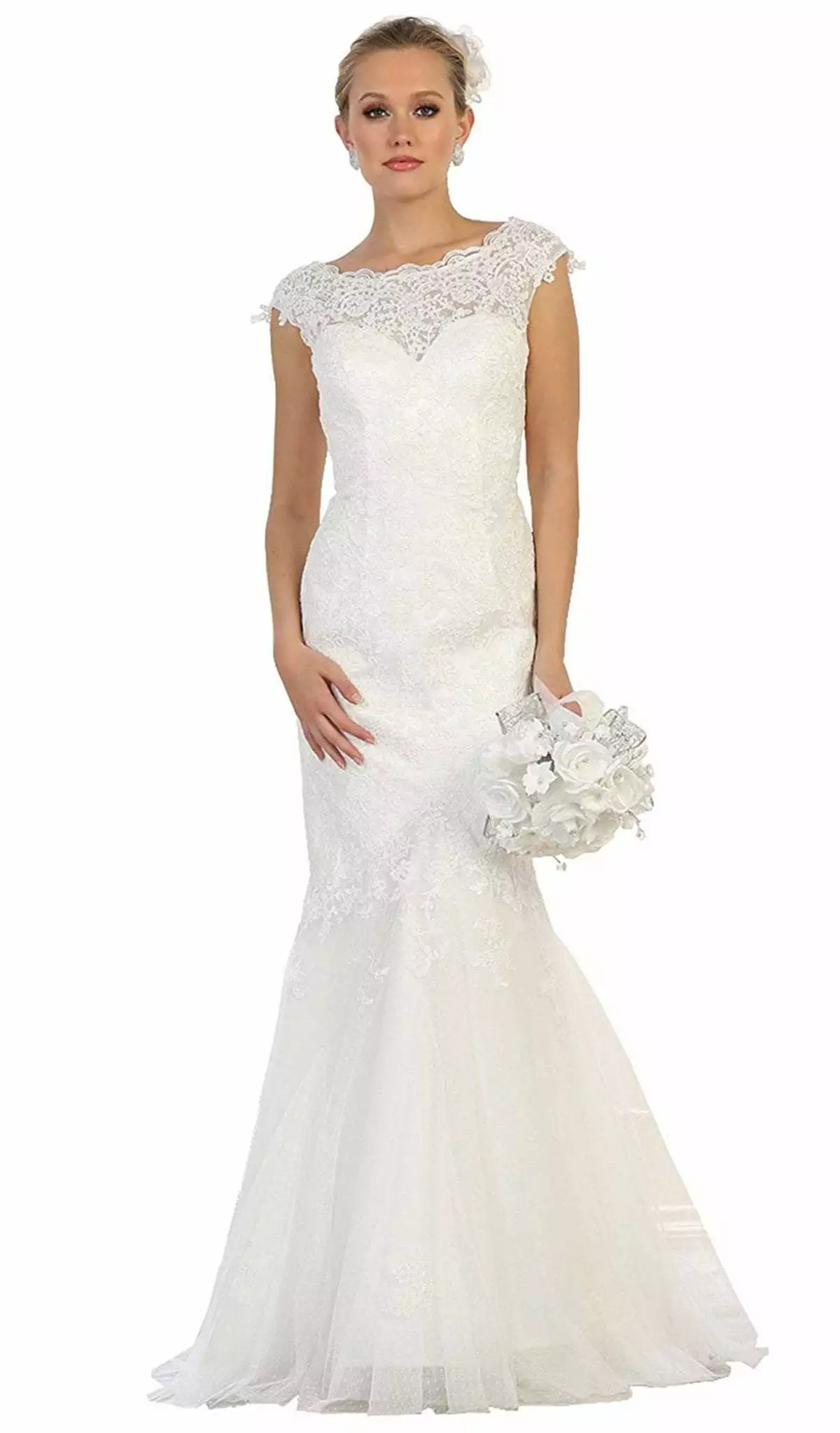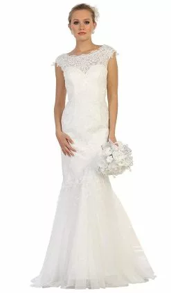 Stand out in every occasion with this creation by May Queen MQ1564. Glams in a bateau neckline with cap sleeves. This lace dress has a sweetheart lining and fitted bodice with a V-back and zipper closure. From the waist begins a mermaid skirt with a sweep train finish. This May Queen dress definitely parades the elegant and classy style.