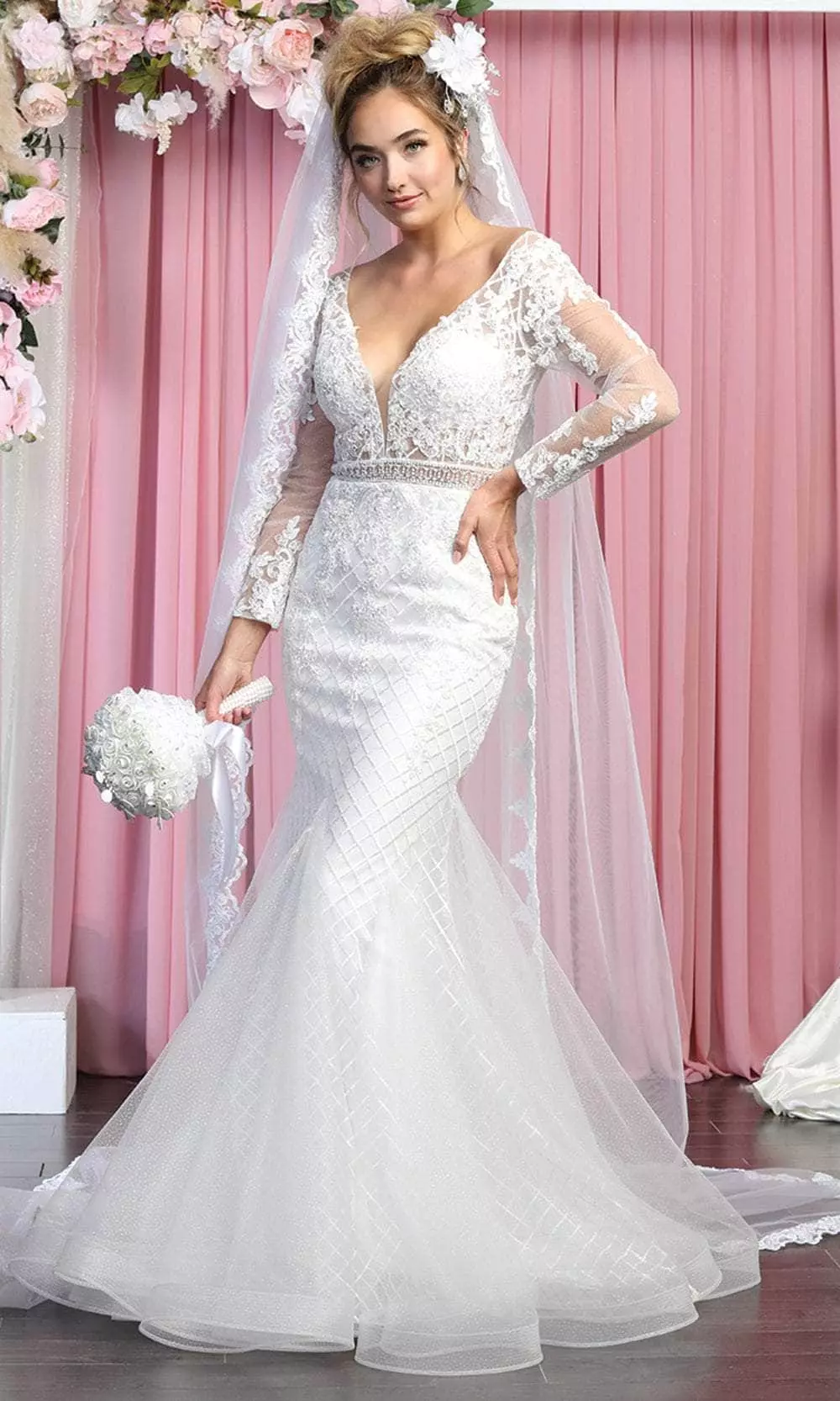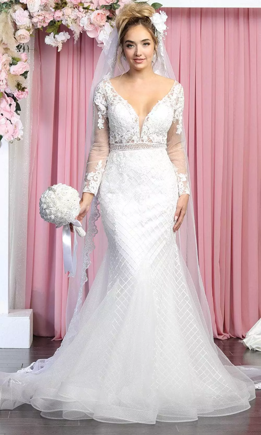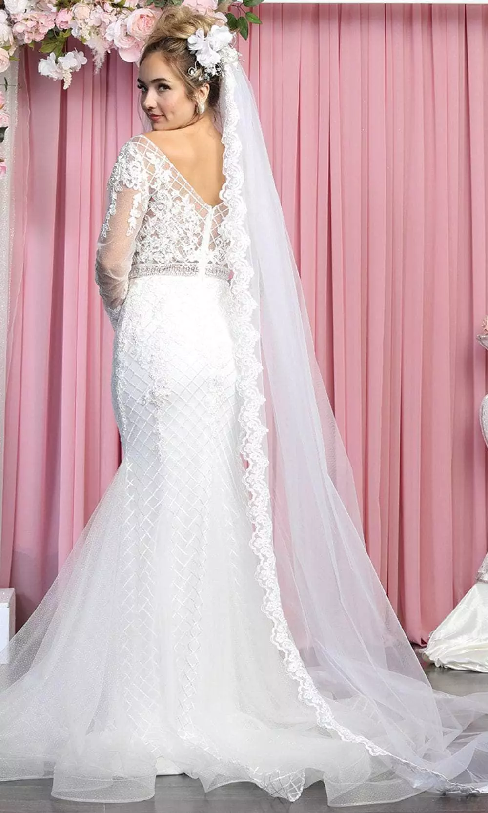 Adorned with lace applique embroideries, this alluring piece showcases a plunging V-neckline with an illusion inset and sheer long sleeves. Accented with a beaded waistband, the geometrical patterned on the mermaid skirt glides into a full-length hem with a brush of train. Model is wearing the Ivory color.