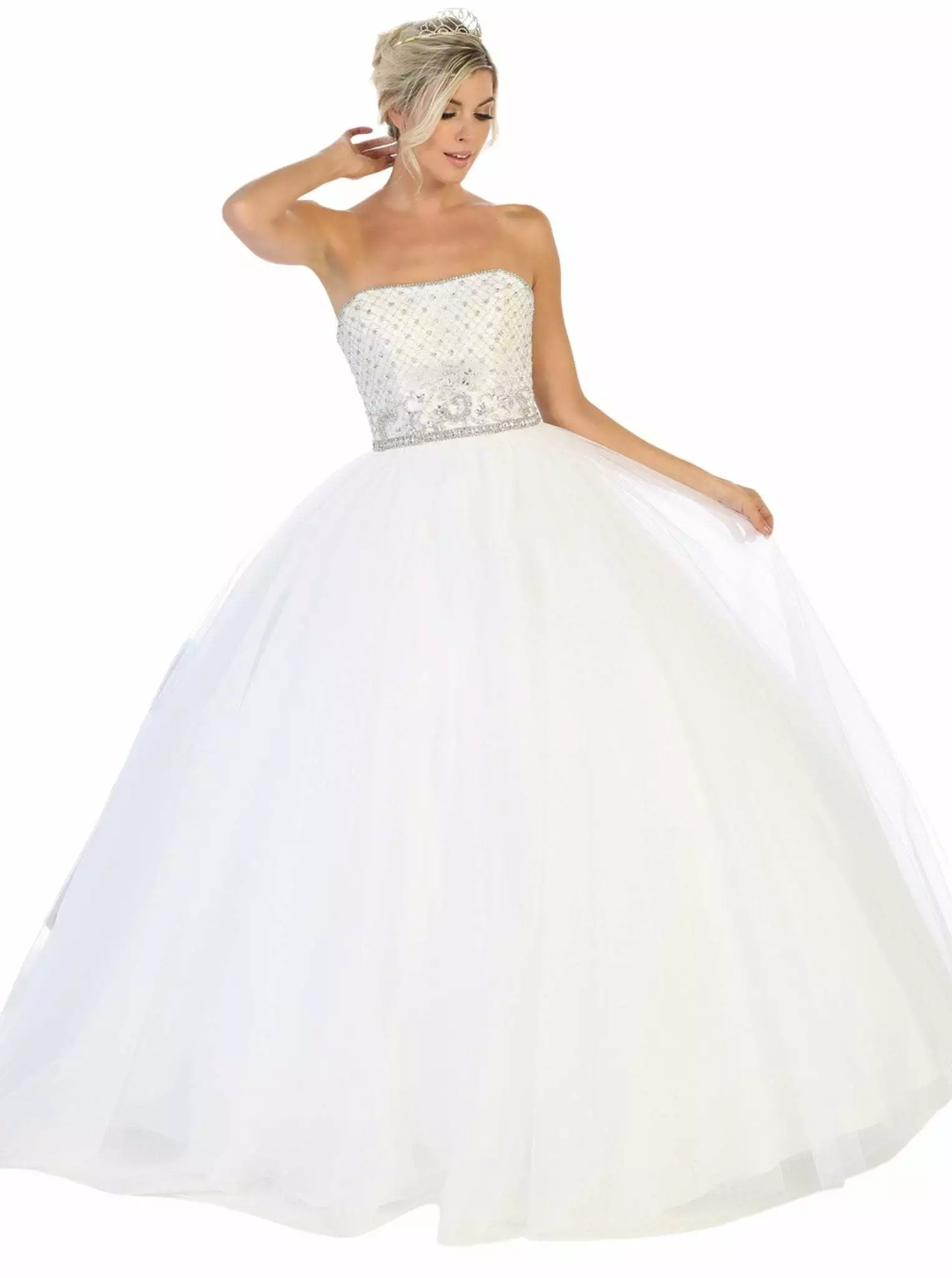 Make your night one to remember in this stunning gown by May Queen LK114. This strapless gown flashes a straight across neckline with fitted bodice richly decorated with glittering embellishments. The back has a lace up closure for an adjustable fit. The skirt opens in a ballgown silhouette. Feminine, bold, and imperial, this gown from May Queen will definitely make you shine!