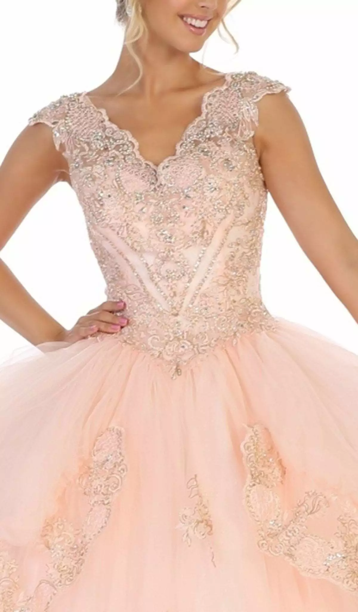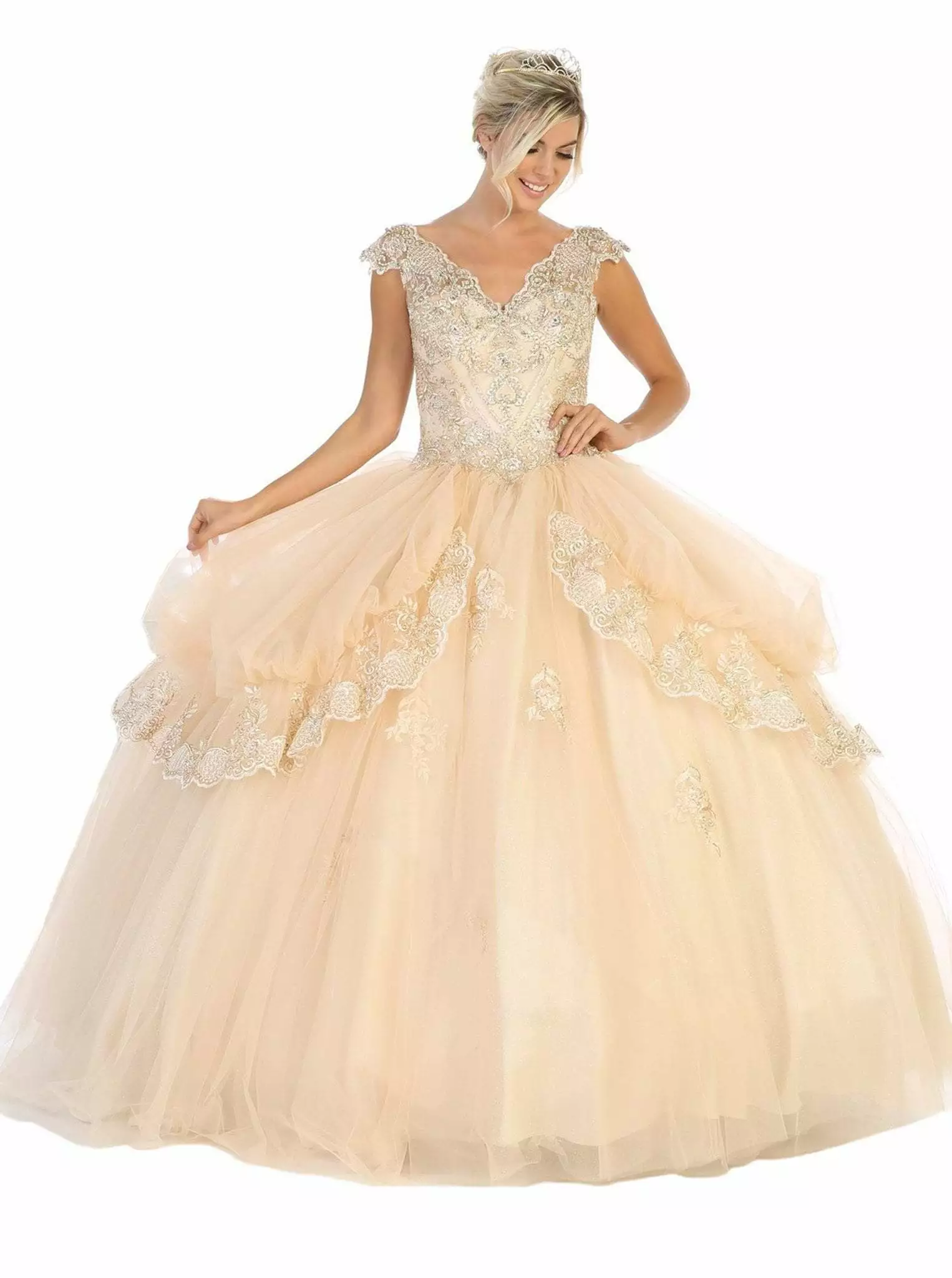 Make your fairy tale dreams come true when you don this opulent May Queen LK118 creation. Spectacularly embellished with jewels on a lace bodice, this stunner shows an illusion v over a sweetheart neckline. Paired with an illusion cutout back and a corset design, the sumptuous ballgown commences from the basque waist as poof details cascades down into full length hemline. Saunter into the ballroom with a dramatic flair in this May Queen masterpiece. Models are wearing the Blush and Champagne colors.