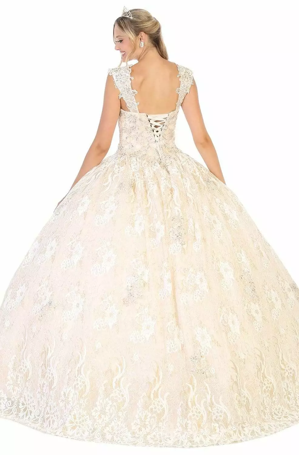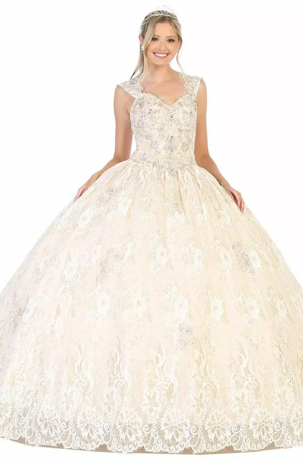 Look immaculately gorgeous in May Queen LK131. This embroidered gown parades in a sleeveless, V-neckline with wide straps. The gown has a fitted bodice and from the basque waist begins a voluminous ballgown skirt. This May Queen creation will let you celebrate that divine feminine beauty!