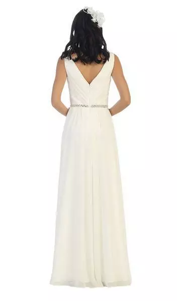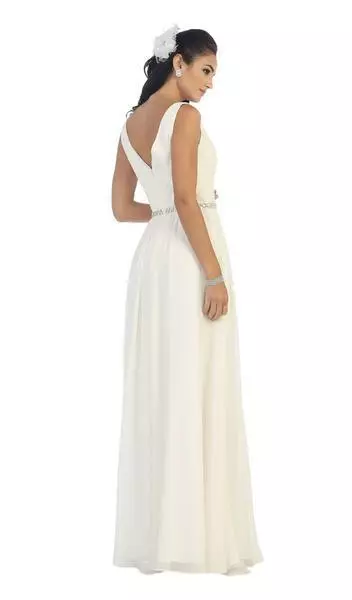 This is a bridesmaids dress with a V-neck and an open back. Designed with a jewel like belt to make it more elegant looking. Model is wearing Ivory color.