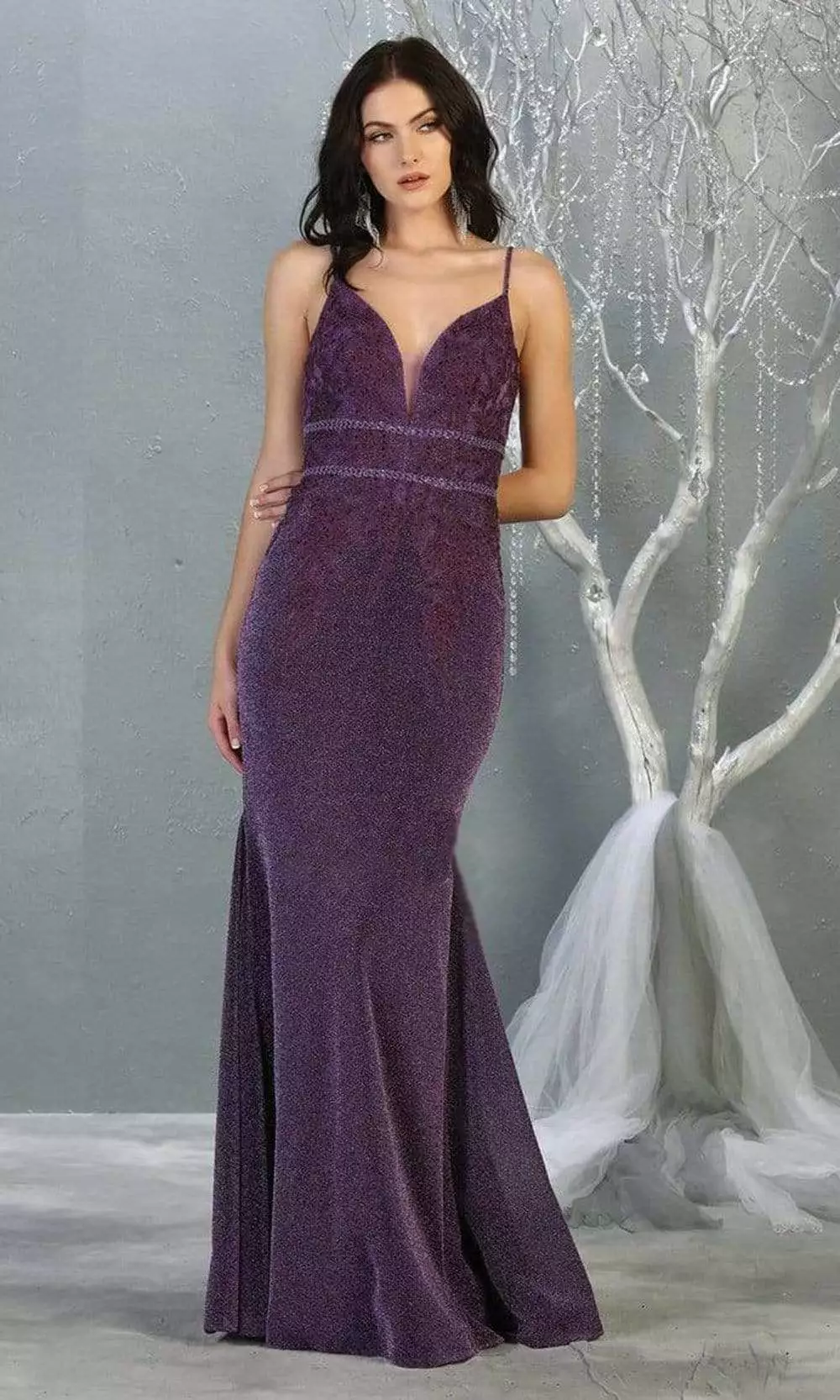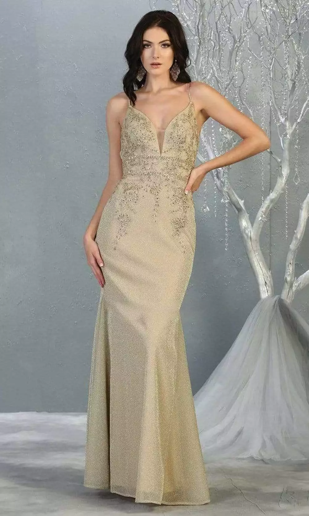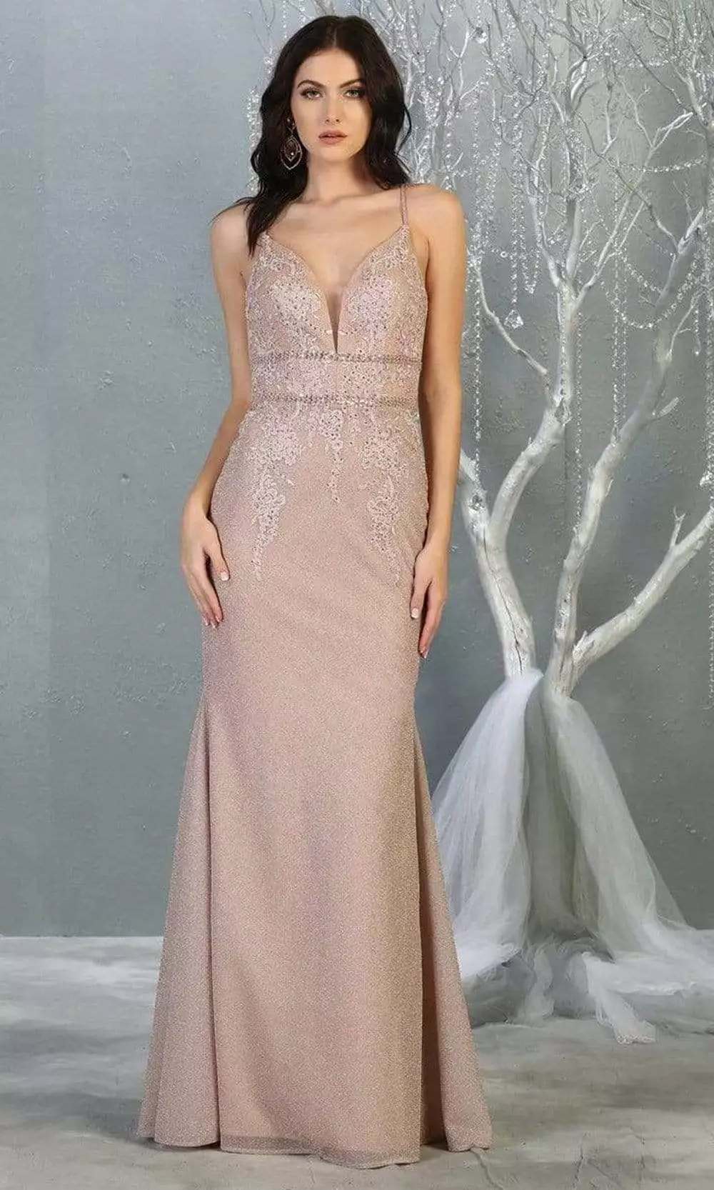 Bask in the romance and class of this May Queen MQ1796 creation. Trailing with lace appliques on a fitted silhouette, this dress shows a plunging sweetheart neckline with an illusion inset. Spaghetti straps support the bodice and converge at a v-styled back. Thin beaded bands wrap the midriff. The trumpet skirt flows and flares into a floor length silhouette. Look like a dream in this scintillating May Queen masterpiece.