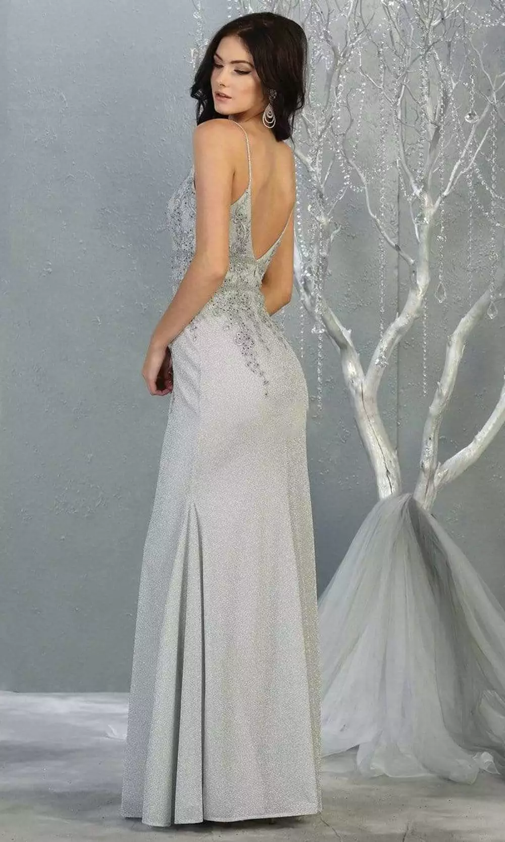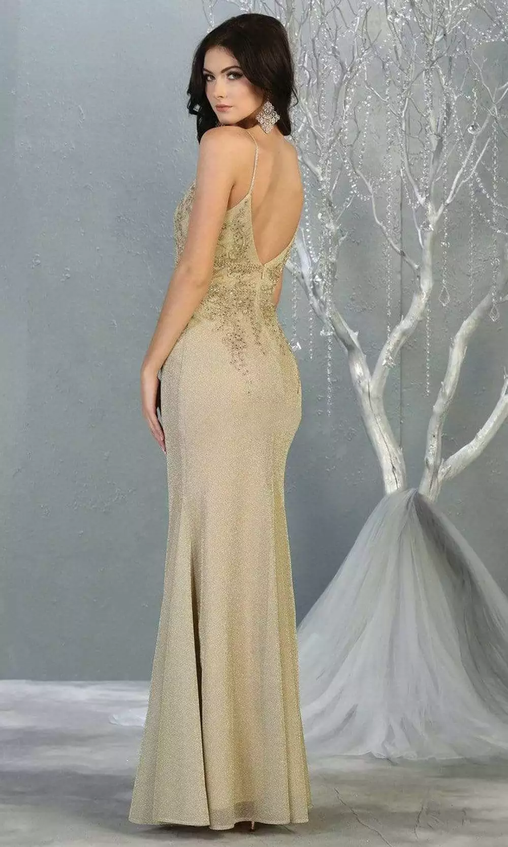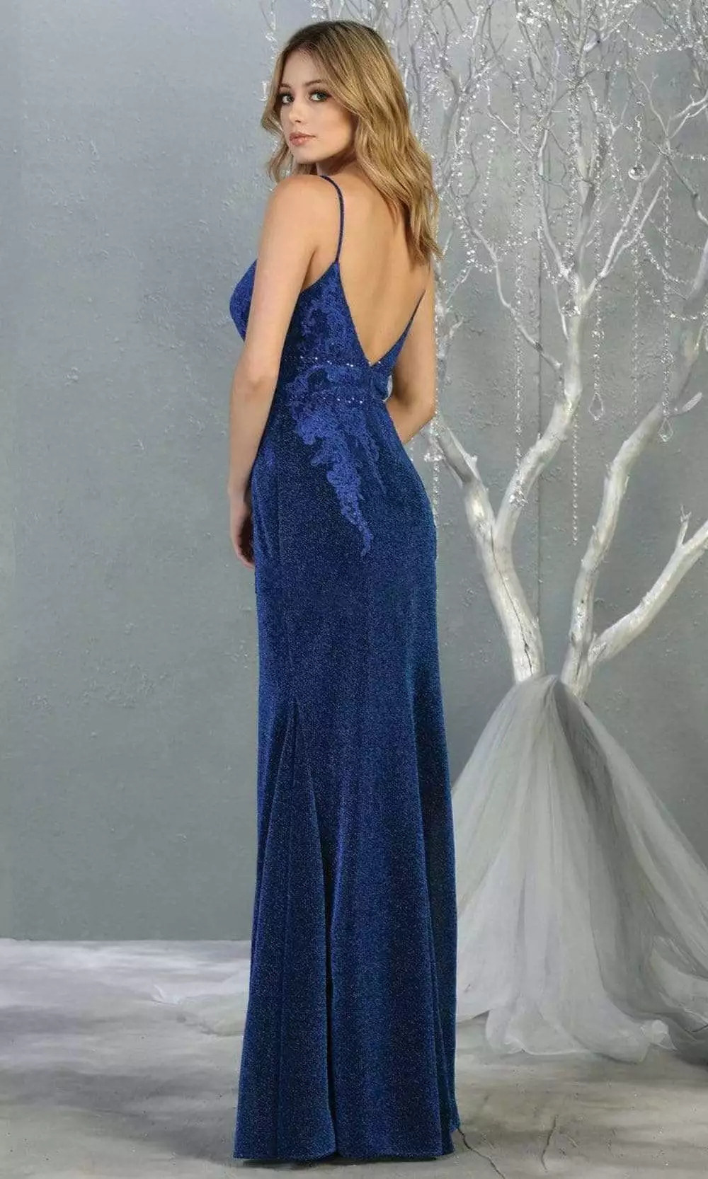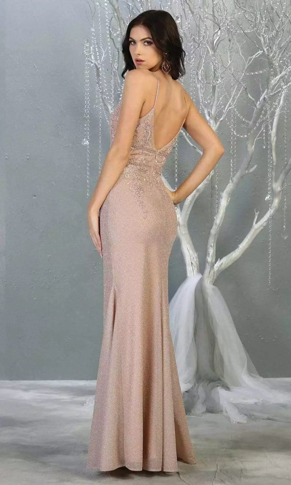 Bask in the romance and class of this May Queen MQ1796 creation. Trailing with lace appliques on a fitted silhouette, this dress shows a plunging sweetheart neckline with an illusion inset. Spaghetti straps support the bodice and converge at a v-styled back. Thin beaded bands wrap the midriff. The trumpet skirt flows and flares into a floor length silhouette. Look like a dream in this scintillating May Queen masterpiece.