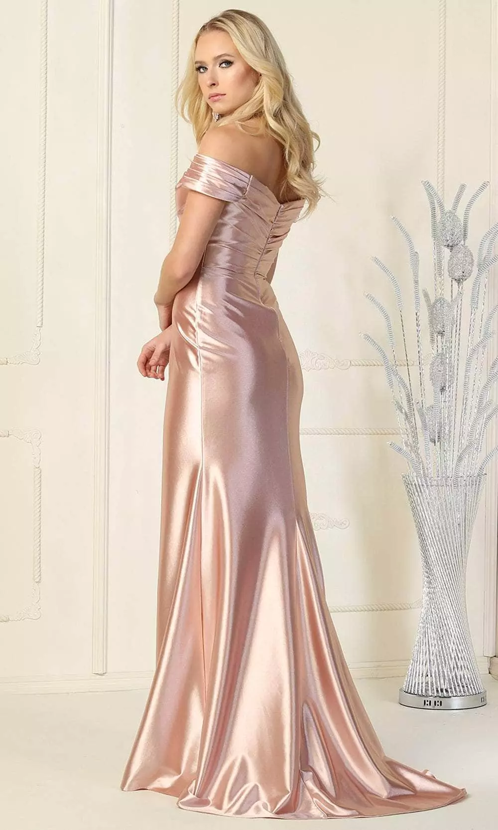 Be the very epitome of timeless elegance as you radiate beauty in this May Queen MQ1892 gown. Astonishingly crafted in luxurious satin, this exquisite piece flourishes an off-shoulder cowl neckline and a low-cut style ruched back with a center zipper. The bodice has fine ruching tailored in princess seam while the sheath skirt flawlessly flows towards the floor in a sweep of train. Get a timeless and trendy look in this creation by May Queen. Wherever you go, whatever you wear, leave a long-lasting impression on the gathering with May Queen’s collection of dresses for bridal, bridesmaid, prom, homecoming, cocktail, formal, semi-formal, and many more themes. Models are wearing Blush, and Gold colors.