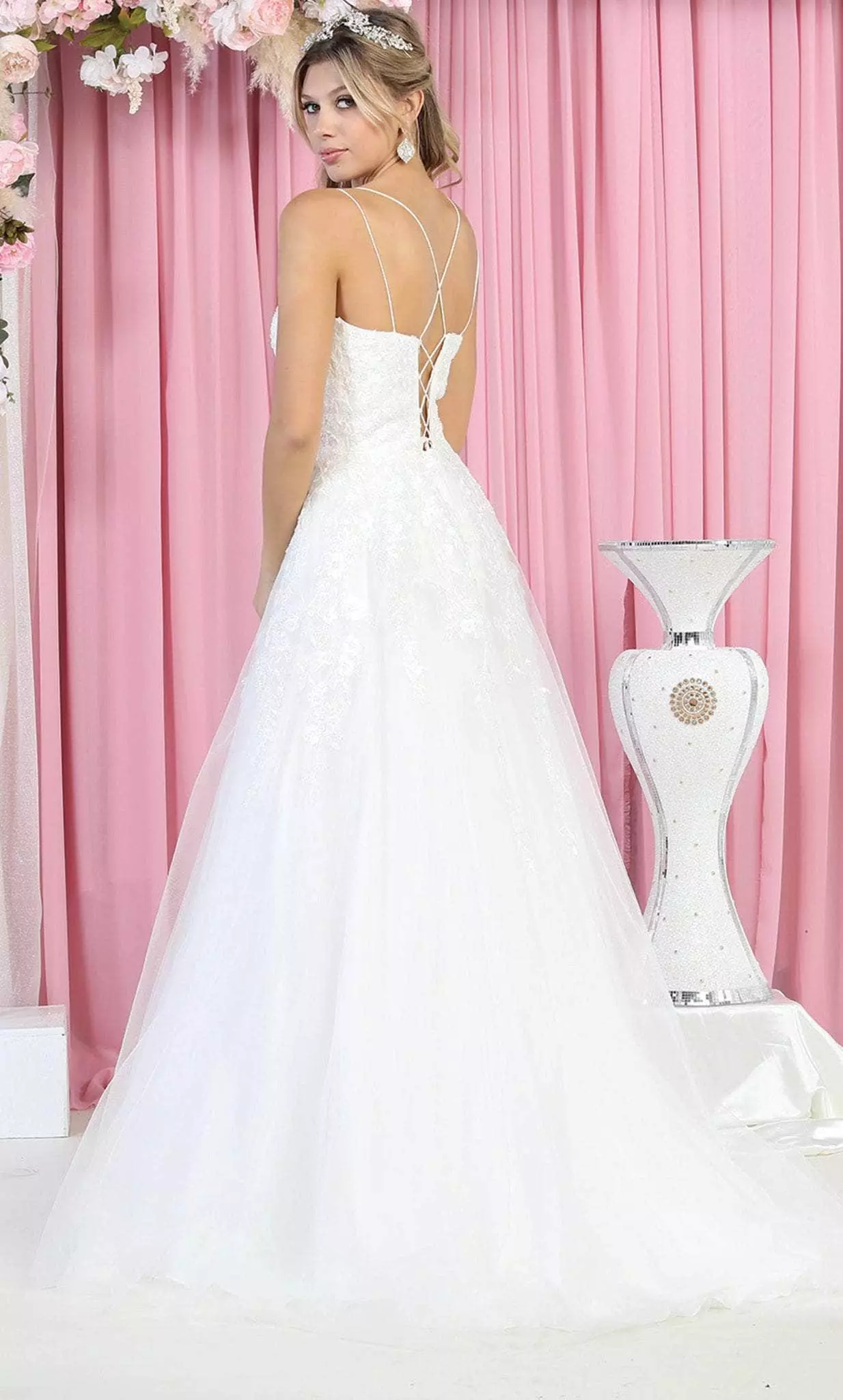 Enter the aisle with grace and beauty in this May Queen RQ7917 wedding gown. Charms with all-over embroidery, this piece is sleeveless and features a modified v-neckline with a sheer inset panel on the bust. A pair of dual spaghetti straps support the bodice and turn into an adjustable lace-up tie closure at the mid-open back. The skirt moulds an A-line silhouette which cascades to the floor length hem and sweeping train. Fascinate the crowd wearing this exceptional May Queen RQ7917 masterpiece. Model is wearing the White color.
