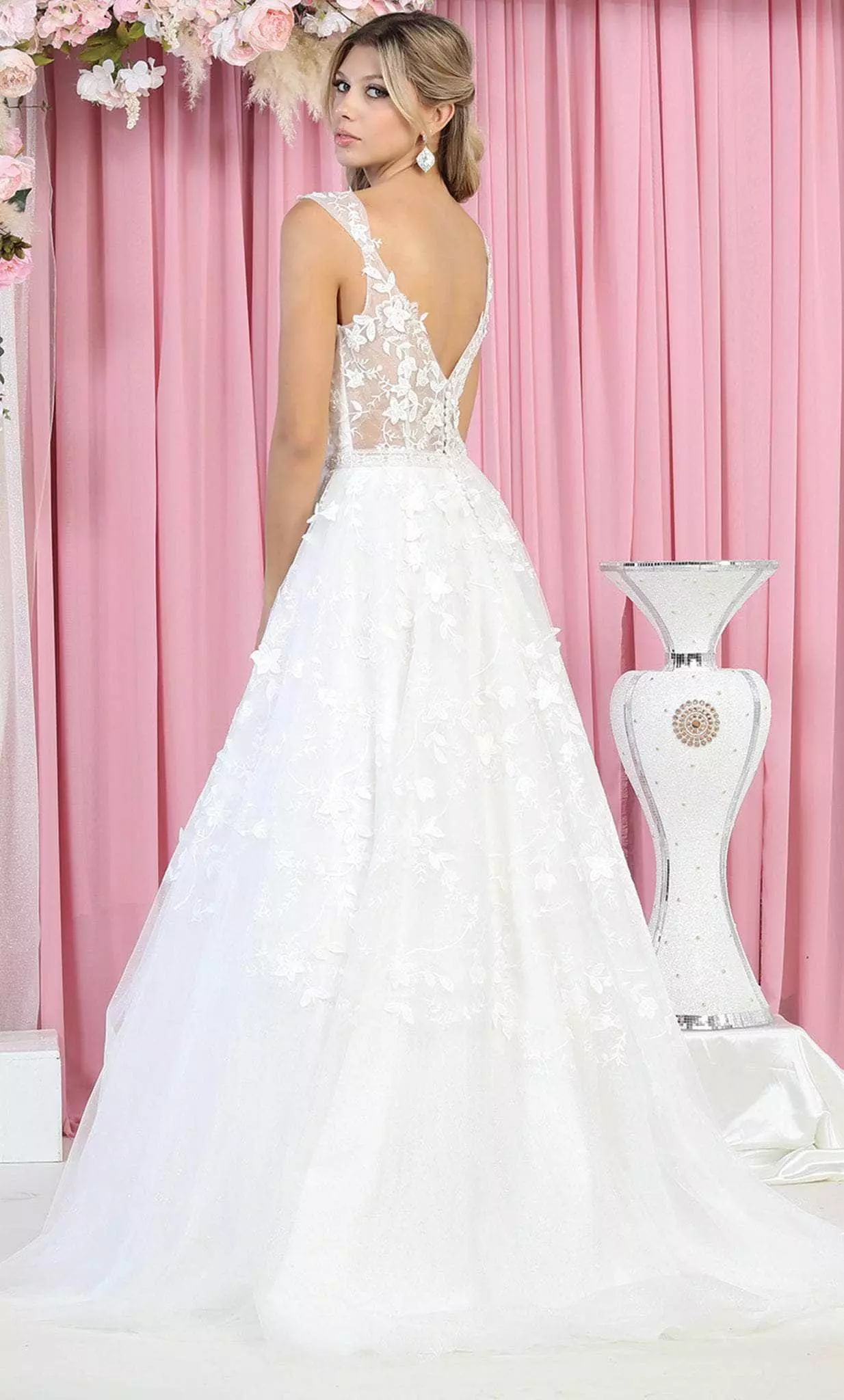 Get glamorous underneath the modern and classic detailing on the A-line silhouette of May Queen RQ7926. This gorgeous bridal gown includes a wide sheer strap with a V neckline and a sleeveless bodice with flower embellishments that falls to a fitted waist. After that, it transitions into an A-line silhouette, and it concludes with a sweep train. Show off your gentler side with this lovely bridal gown by May Queen RQ7926! Model is wearing Ivory color.