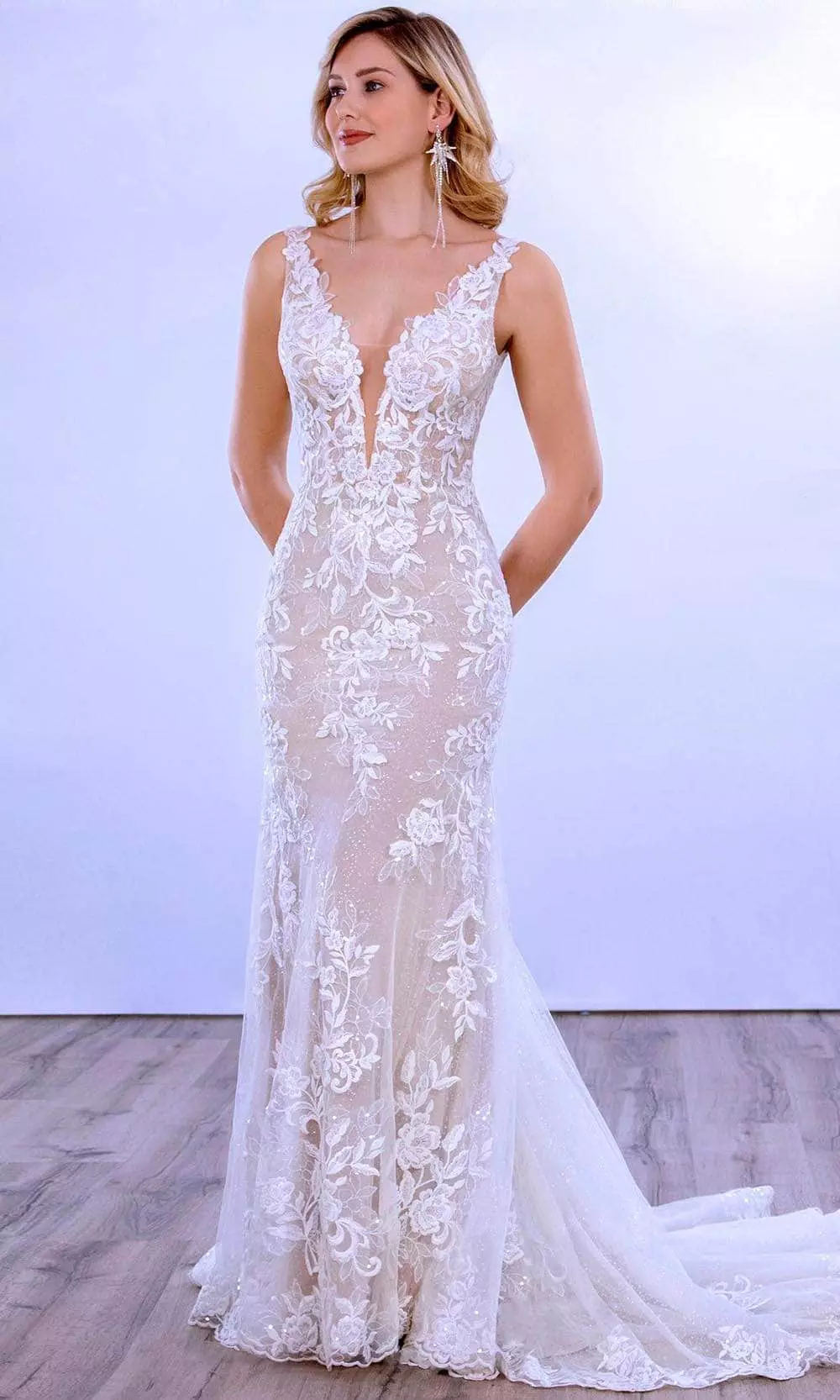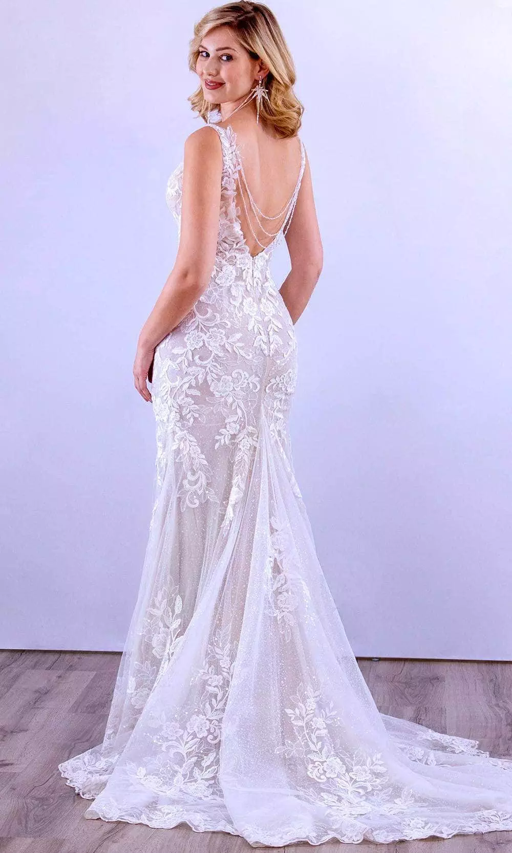 Be the center of attention in this glamorous MNM Couture 10085 wedding dress. This dress showcases a deep V-neckline in a sleeveless fitted bodice accented with scallop trims along the midriff. The back allures in an open style with dangling triple beaded bands which adds elegance as you pair it with sparkling earrings. The skirt tapers over the hips as it flares with its tulle overlay and finishes to a dramatic sweep train. This MNM Couture wedding gown will leave you a memorable moment on your big day. Model is wearing Ivory/Nude color.