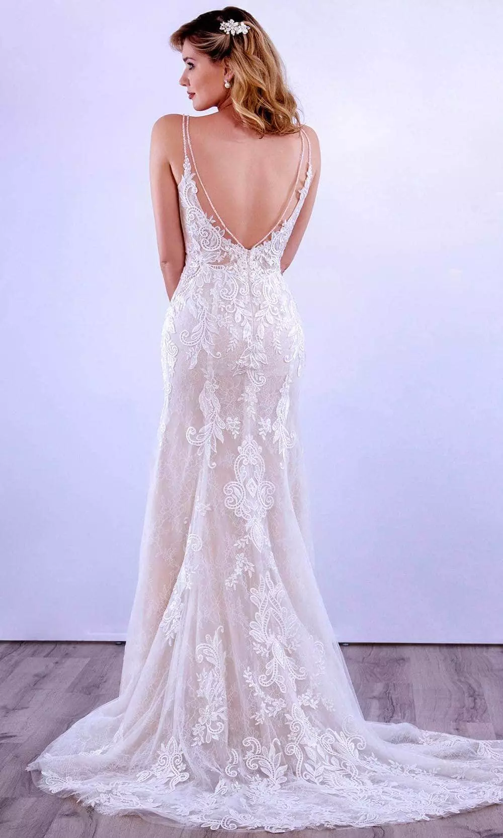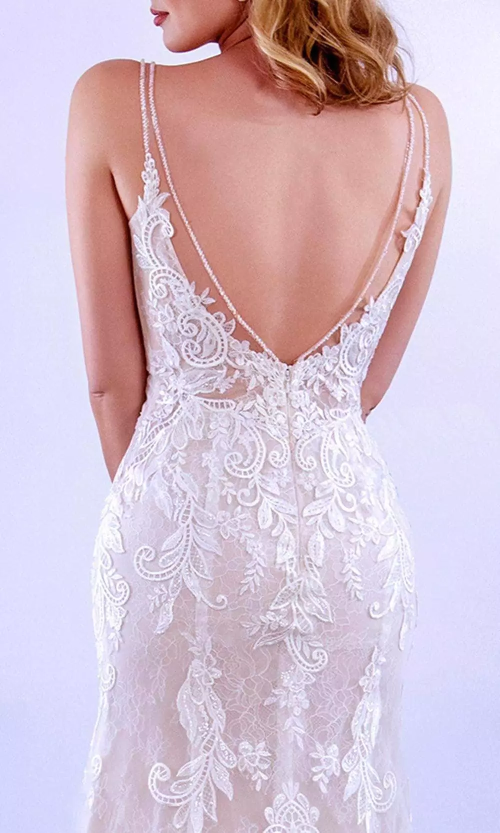 Flatter your figure and return to the 20s by wearing this utterly fetching ethereal mermaid dress that signals class and sophistication. This dress can cut a dash when picked in line with your personality with the gorgeous V-shaped that hugs your bodice richly adorned with beads and Lace appliqué which flows in your body contouring with the Tulle fabric sheath. Make your day romantic with this flawless dress by MNM Couture. Model is wearing Ivory/Nude