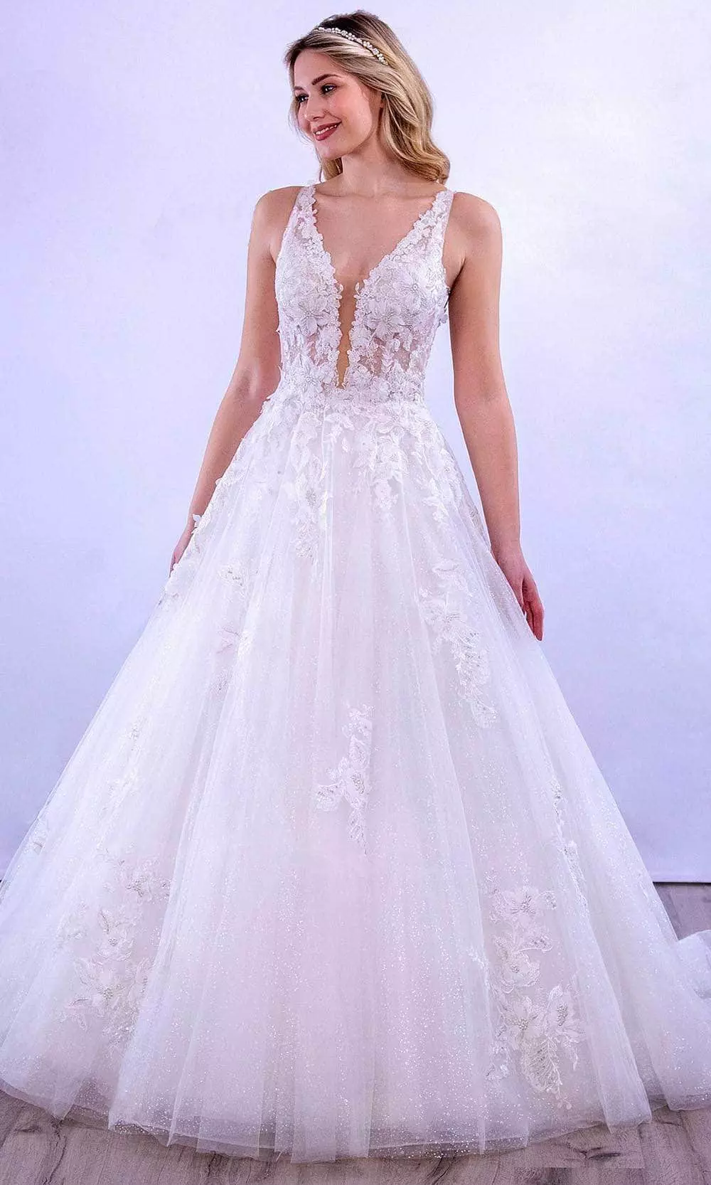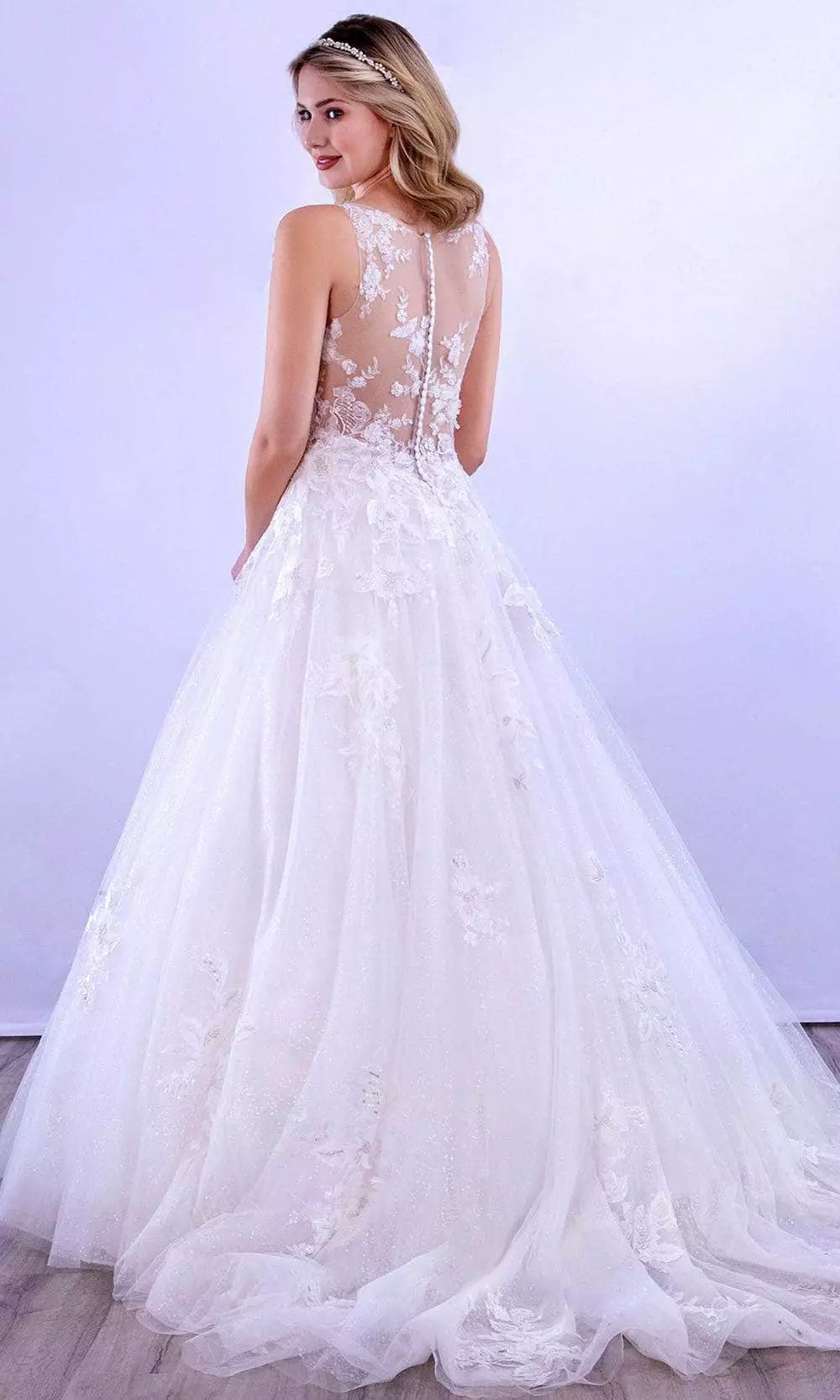 Walk in glamour and let all heads turn on you in this creation by MNM Couture. An enchanting fairy-style princess dress with a twist. Whatever event you have on your list, you will definitely find this perfect daring, sheer V-shaped bodice that has Lace appliqué and beads artfully positioned to preserve modesty but the lingerie effect is clear. The skirt is a gorgeous swathe of shiny Tulle flecked with Lace appliqué. Model is wearing Ivory/Nude