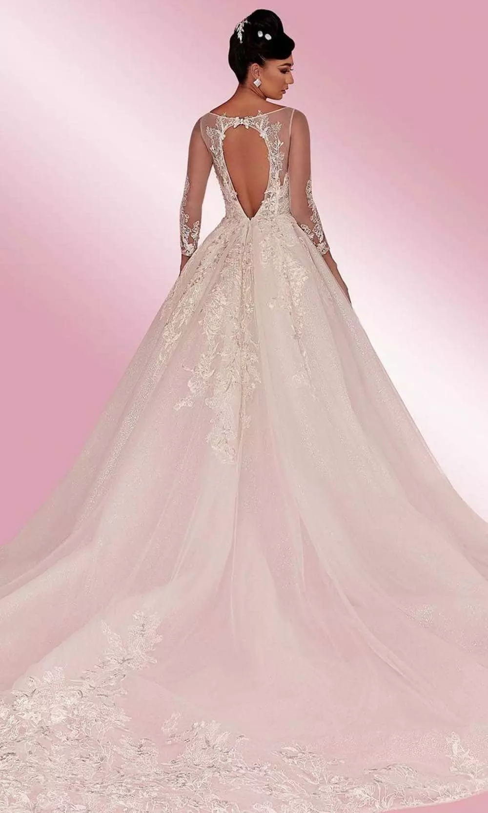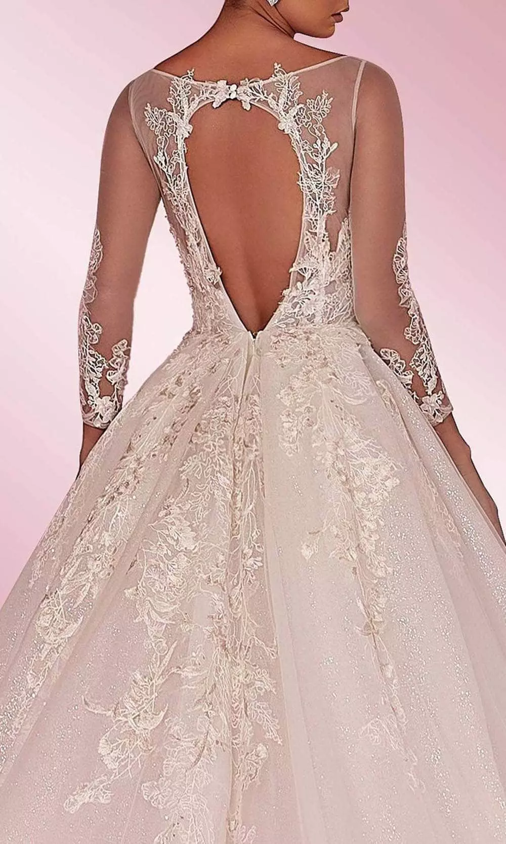 Bloom with loveliness in this dazzling lace applique a-line dress from MNM Couture. Show off your classy style by wearing this a-line dress that has an illusion neckline and a sheer long sleeve with high-quality lace applique details and an open-back that will still keep you modest as you walk down the aisle. Give it a shot and be the spotlight, fantasize night like Cinderella by wearing this extravagant dress. Model is wearing Off White