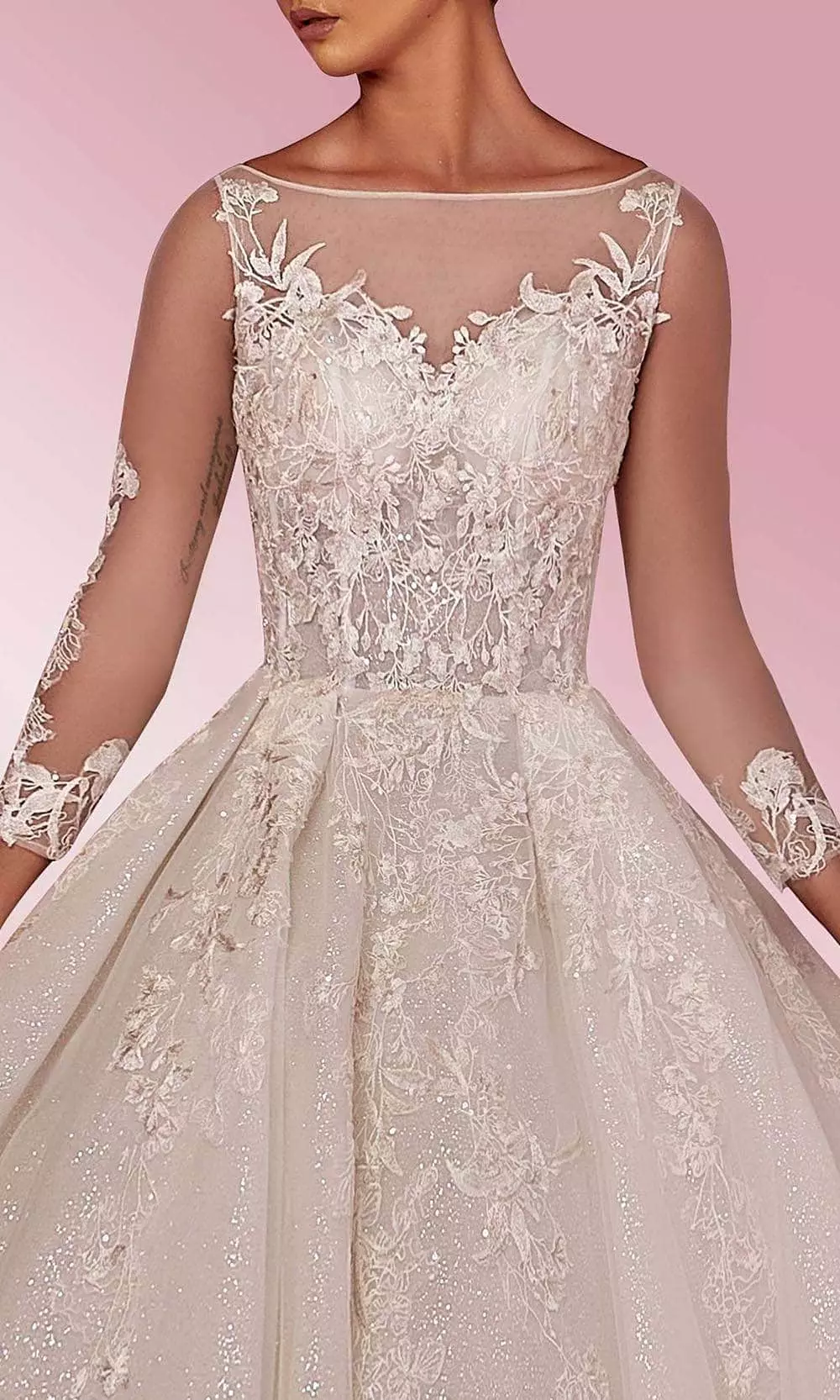 | Details: | Illusion neckline, Lace applique, Sheer long sleeve, A-Line |