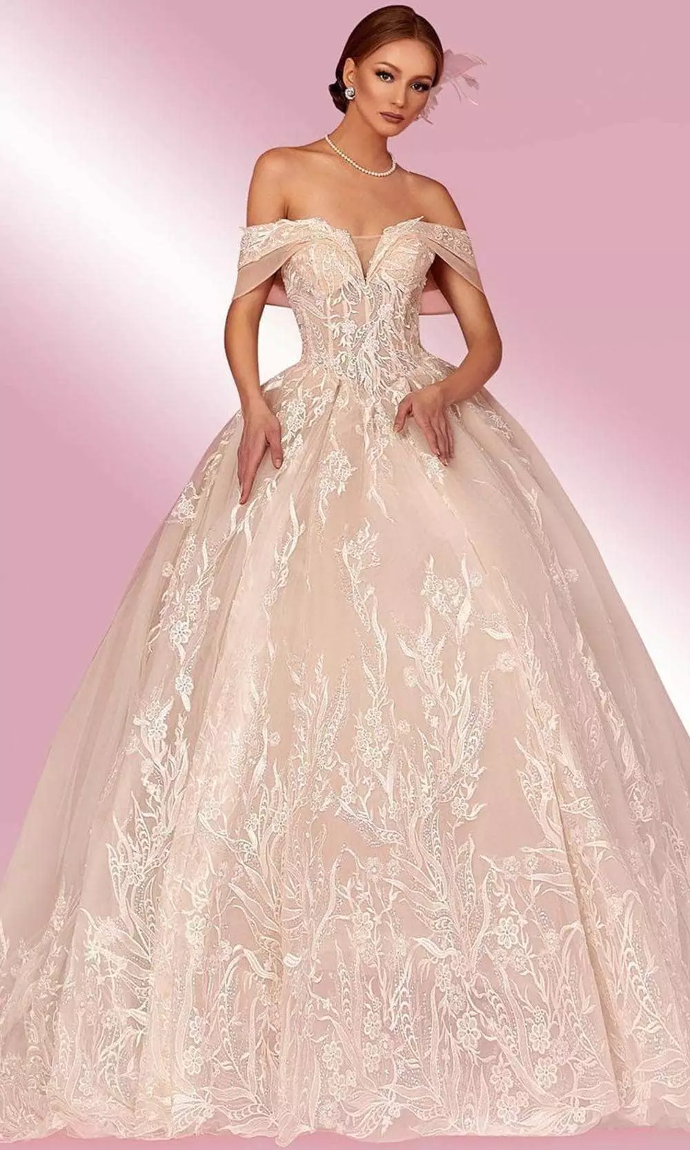 Bloom with elegance in this stunning lace-applique ball gown by MNM Couture. Wearing this ball gown that features an off-shoulder with draped details, high-quality lace applique accents, and a lace-up back that will get the audience’s attention as you walk down the aisle, will flaunt your sophisticated sense of style. Try it out and steal the show; imagine yourself having a magical night like Cinderella while wearing this gorgeous gown. Model is wearing Off White