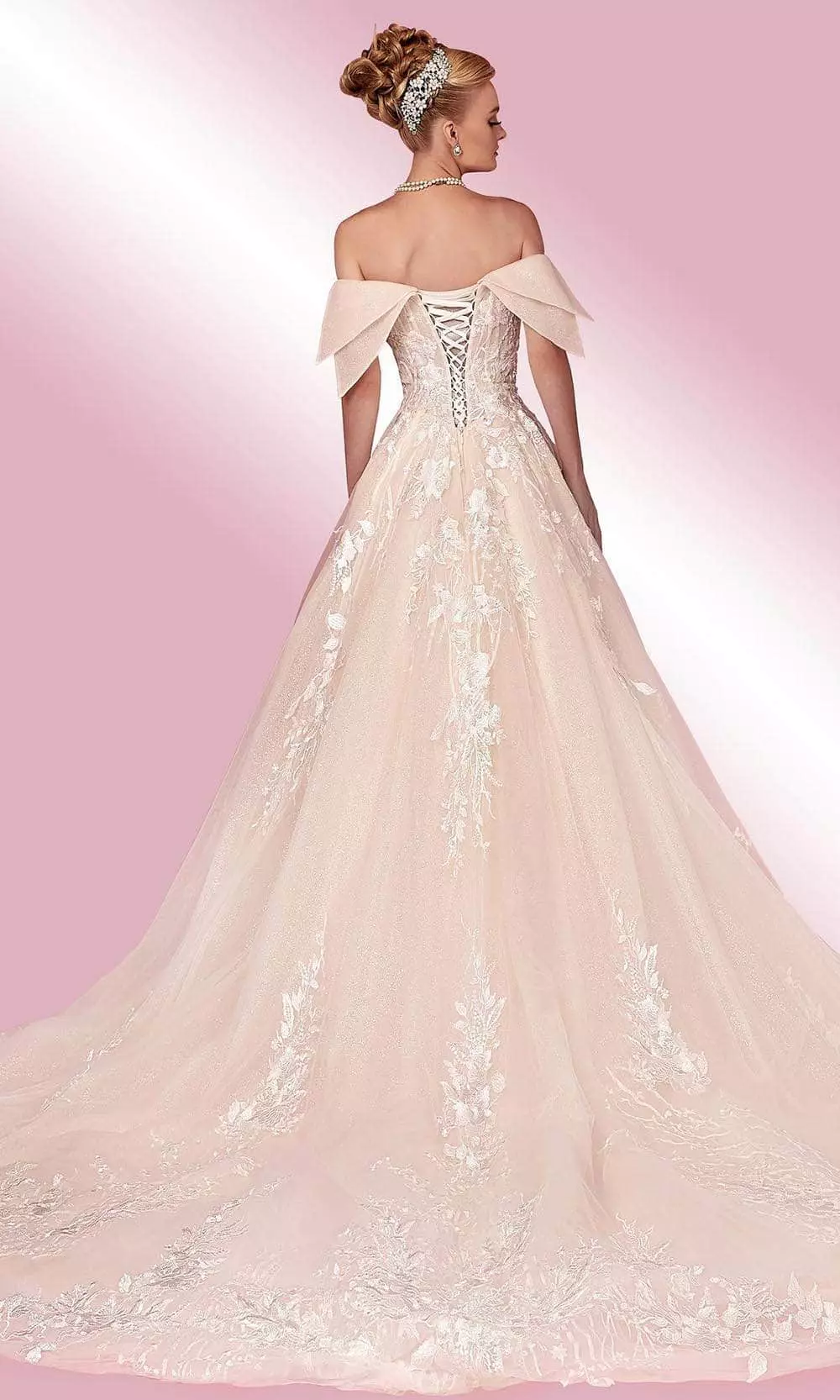 | Details: | Off Shoulder with draped details, Lace applique, Lace-up back, Basque, A-Line |