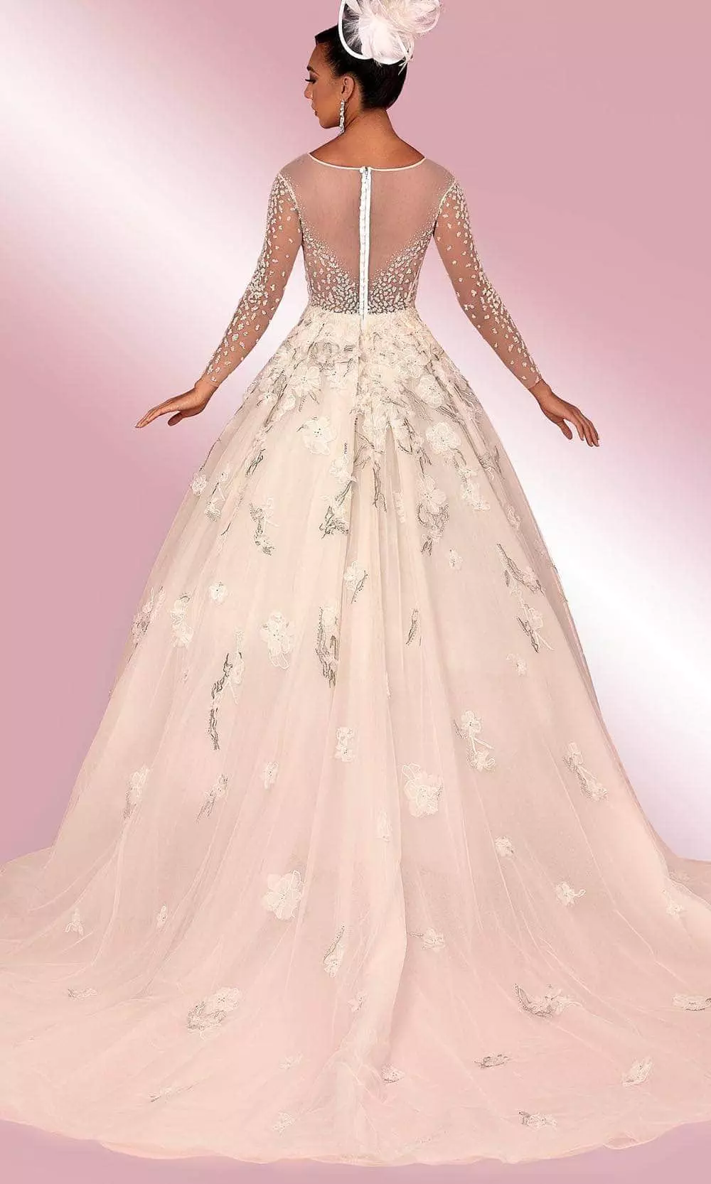 Do you desire to stand out from the crowd on your special day? Wear this lovely dress with an illusion neckline with sheer long sleeves to showcase your spirit and make your wish come true. This A-line dress has a goddess-like train with lace and flower accents that is perfect for your body. This dress will certainly make a big impression as you pass by the crowd and impress everyone. Model is wearing Off White