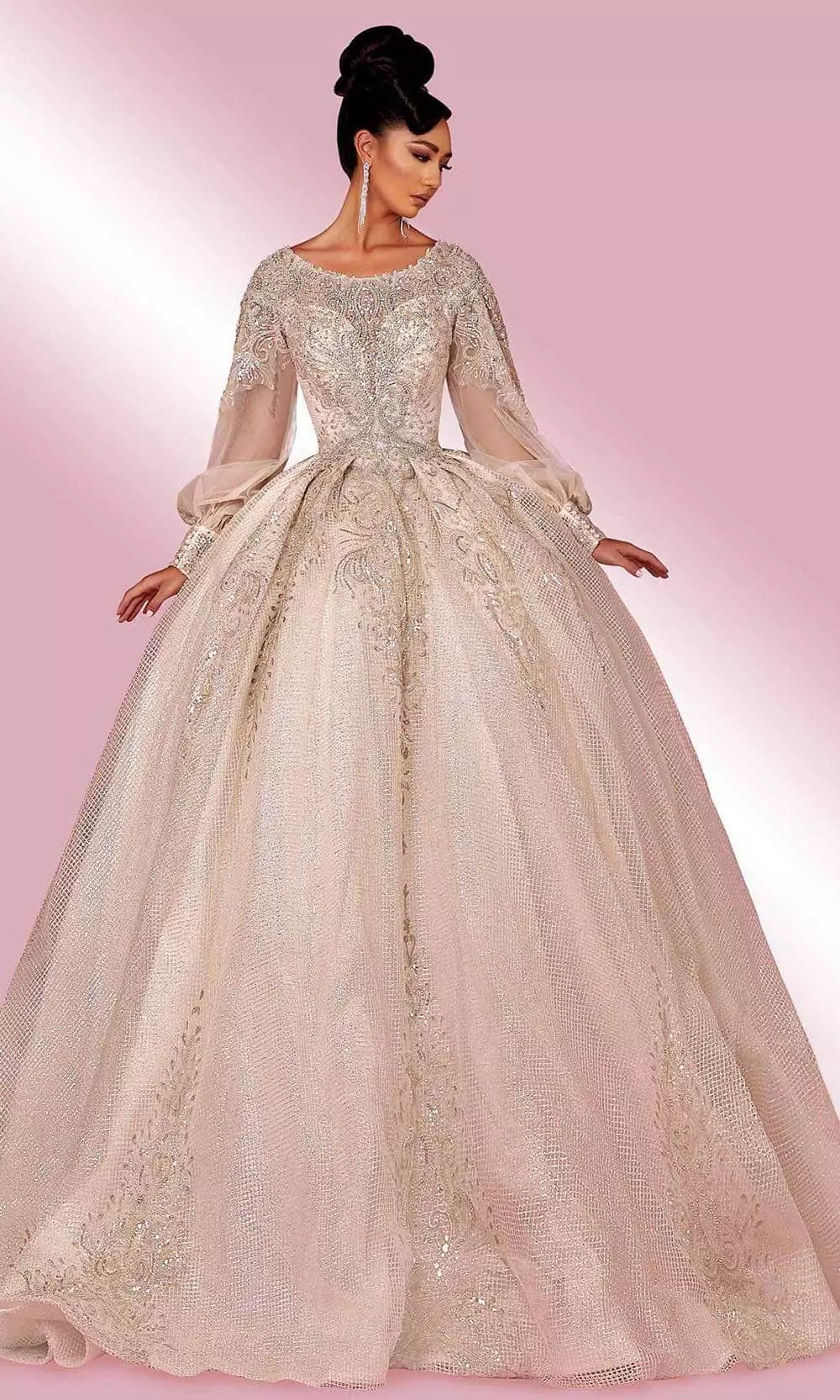 | Details: | Illusion neckline, Bishop sleeves, Sequin embellished, Ball gown |