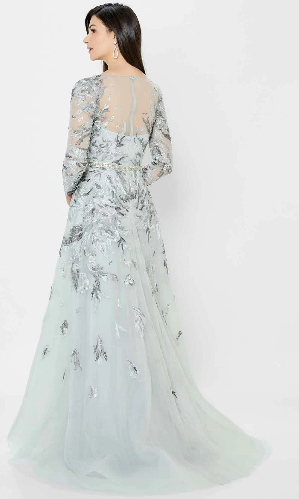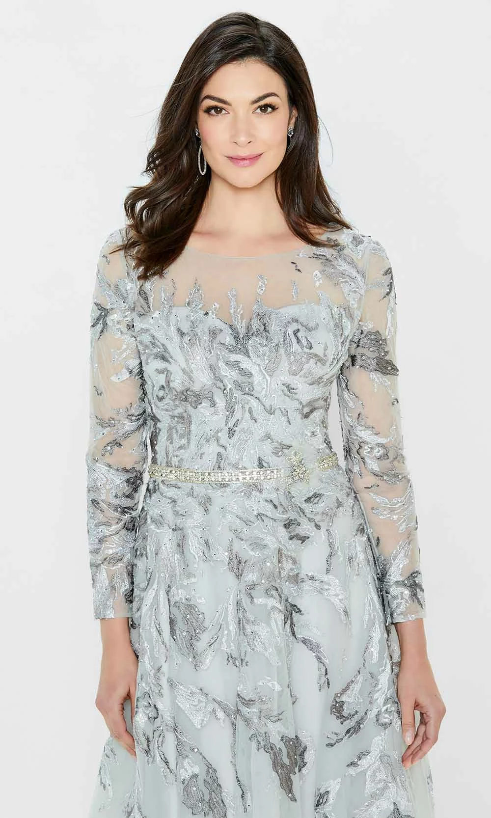 Emanate a sophisticated vibe while making a dramatic entrance in this classy Montage by Mon Cheri 122906 gown. This evening gown has an A-line silhouette and is embroidered in tonal metallic threads on tulle fabric. It also has an illusion bateau neckline and long sleeves. This elegant mother of the bride gown is finished with a beaded belt, a partial illusion back, and a sweep train. Make an extraordinary statement when you walk in this classy Montage by Mon Cheri dress. Whether your style is modern trendy or timeless classic, Mon Cheri will clothe with poise, elegance and grace for your momentous occasion.
