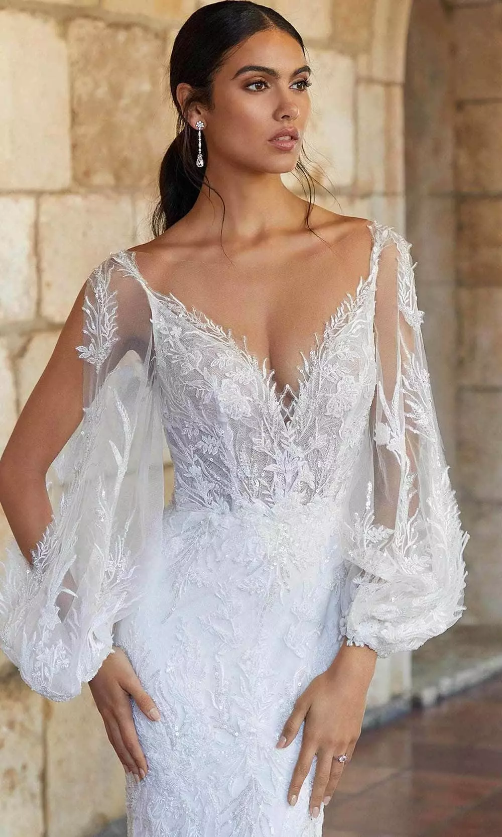 Get ready for everyone to stop and stare when you show up in this Mori Lee Bridal 1086 masterpiece. This absolutely breath-taking gown is adorned with lace embroidery, patterned sequin and beadwork all over its length. The sleeveless style features an illusion bateau neckline with plunging V-notched detail, while a detachable side-slit long bishop sleeve adds more style to the outfit. The daring back flaunts a low open-cut detail and has covered buttons. The skirt is fitted through the hips and flares from the knees into a mermaid silhouette that ends with a semi-chapel train. This Mori Lee Bridal creation will definitely bring out the goddess in you! Model is wearing the Ivory/Sand/Honey color.