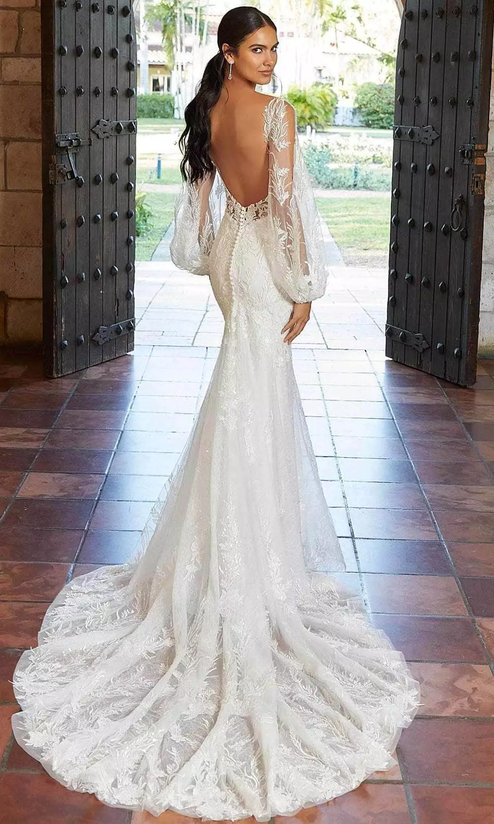 | Details: | Sleeveless, Plunging V-Neck, Detachable Long bishop Sleeve, Sequins, Beaded, Lace Embroidery, Open back, Buttons, Semi-Chapel Train |