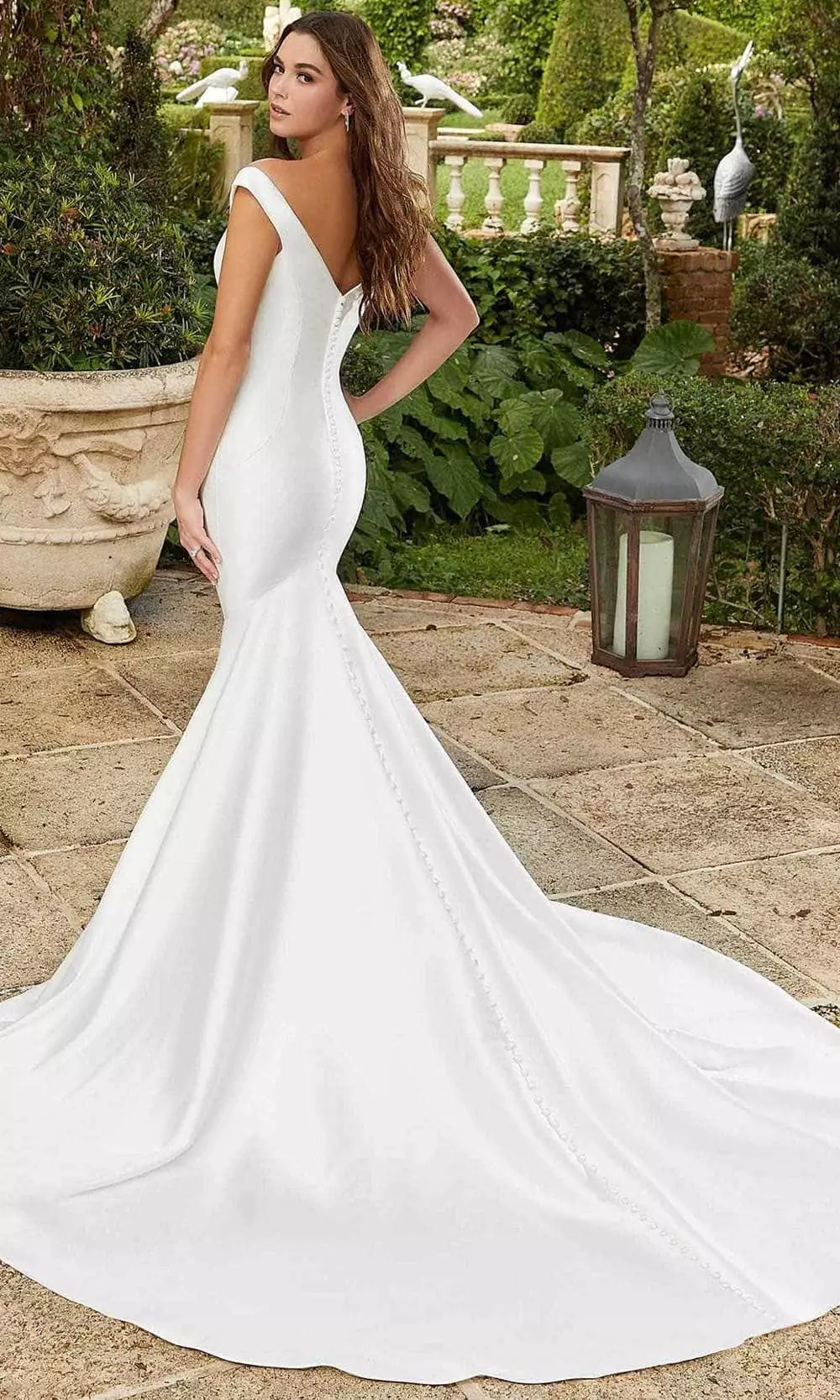 Strike a pose as you enter the room in this exquisite Gemma wedding dress from Mori Lee 12143. Stretch Larissa satin gives the figure-hugging fit and flare silhouette a brilliant appearance. Your curves will be accentuated and the dress will have a polished and tailored appearance thanks to the seams that have been expertly set. A traditional V-neckline is followed by elegant cap sleeves and a matched V-back,as the trumpet skirt adorns with lovely buttons that extend all the way down to the bottom of the chapel train. Make your grand entrance at the threshold of the ballroom, a memory of perfection wearing this divine wedding creation from Mori Lee. Model is wearing Diamond White color.