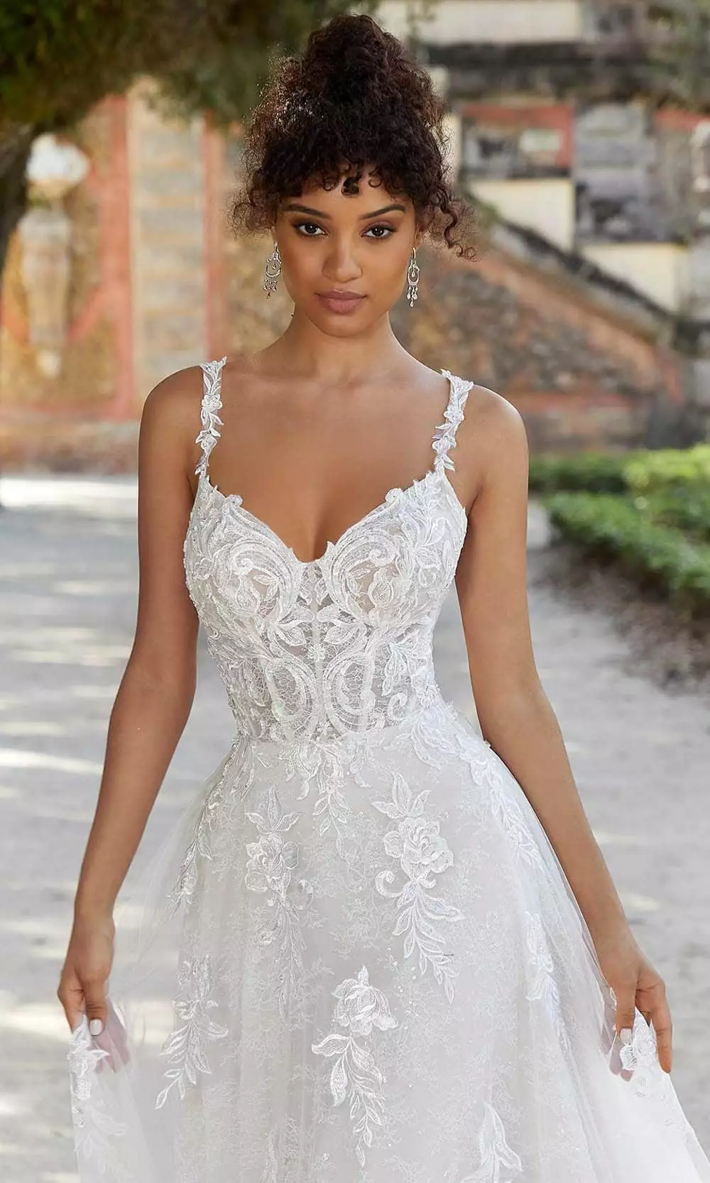 In this wedding dress from Mori Lee Bridal 2479, get ready to stun everyone. On your wedding day, you’ll feel beautiful and romantic in an A-line wedding dress with a Chantilly lace silhouette. The V-neck corset bodice features exquisite lace appliqués made of crystal beads. A delicate and elegant touch is added by the thin appliquéd straps that connect to the open back with button fastening. Everyone will stop and look in amazement as you go down the aisle in this stunning wedding dress from Mori Lee Bridal. Model is wearing Ivory/Latte/Honey.