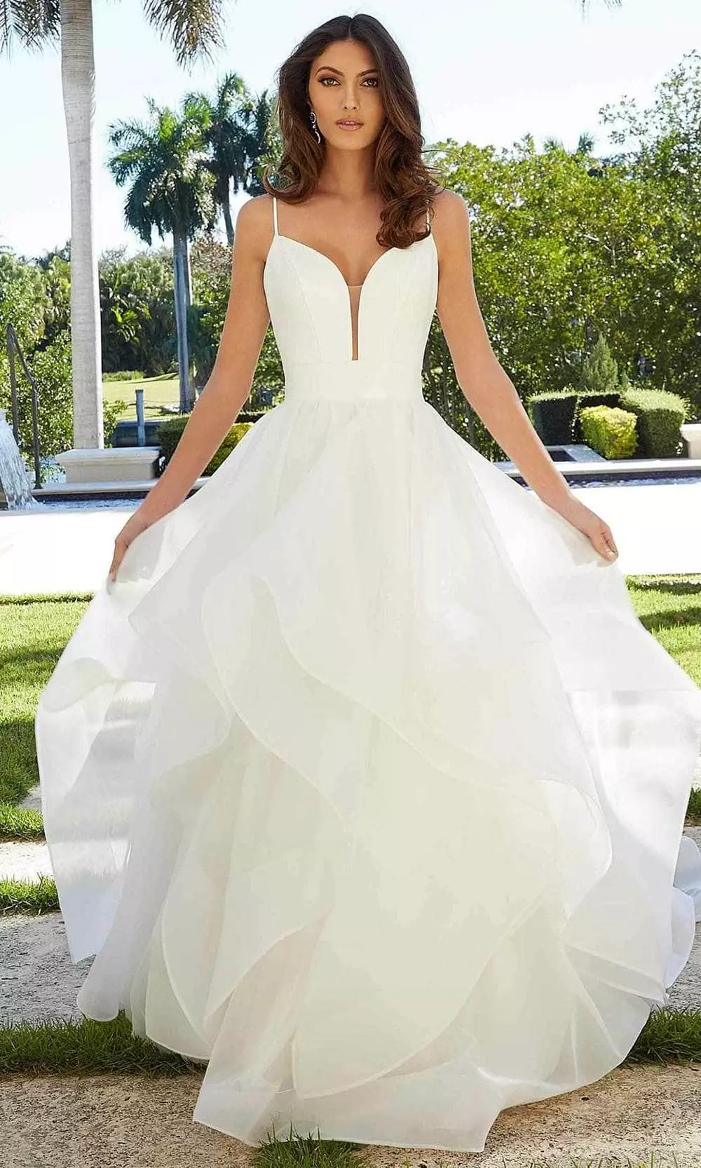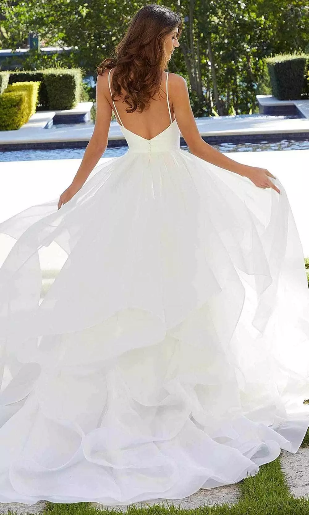 | Details: | Spaghetti Straps, Flounce Organza Skirt, Train, Clean Seams, Buttons |