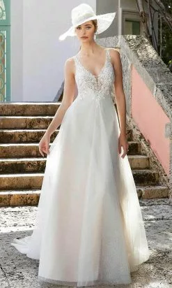 Breathe verve and sophistication into your wedding day in this Fannie Wedding gown by Mori Lee 6972. This bridal gown features a lace-appliqued bodice with a plunging neckline and a stunning open back with covered buttons. This sleeveless beach wedding dress is fashioned in sparkle tulle in an A-line silhouette and finishes in a chapel train. This creation of wedding dress is a stunning example of boho elegance. Make magic in this grandiose Mori Lee Bridal masterpiece. Model is wearing Ivory/Latte/Honey color.