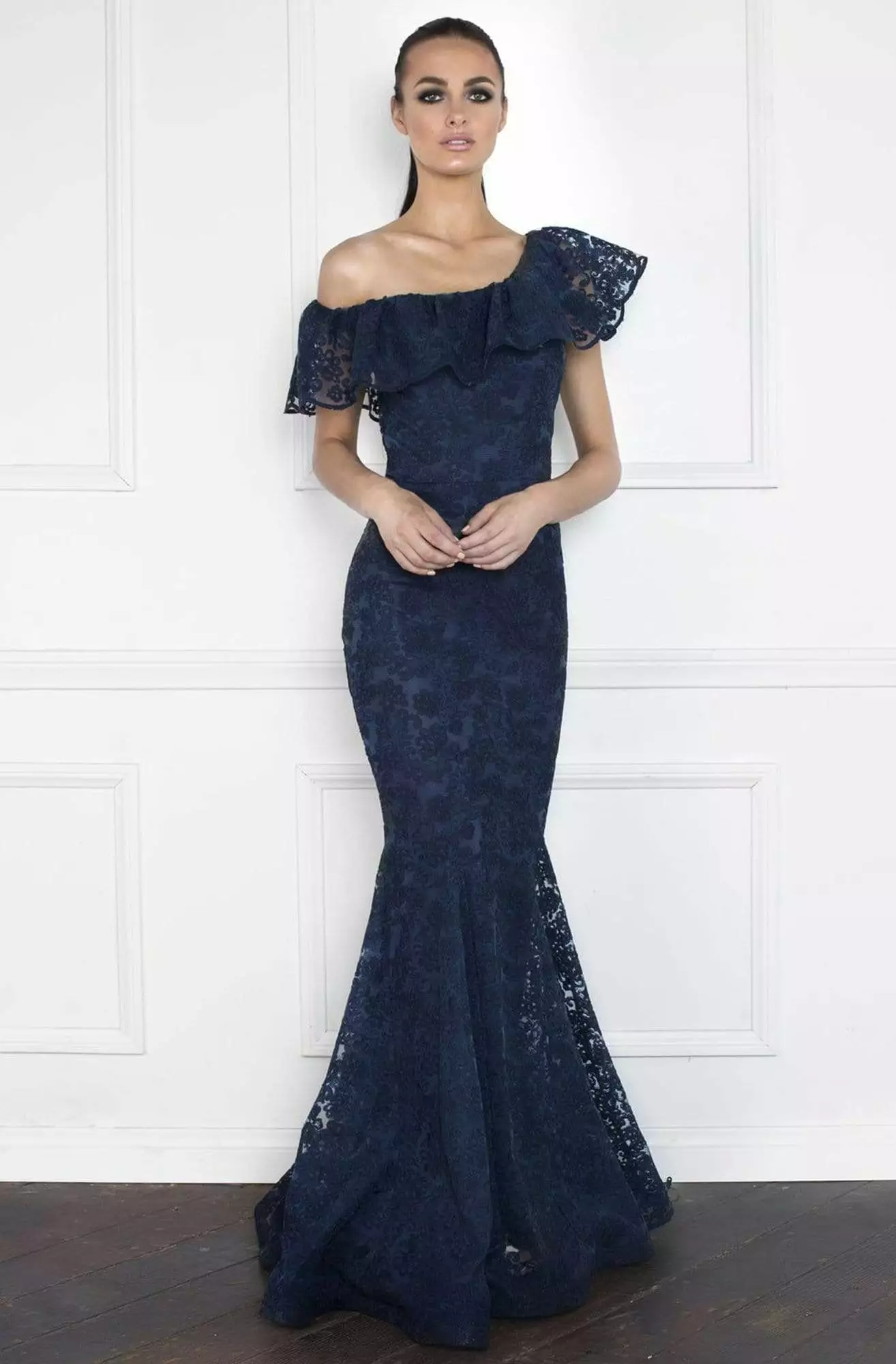 | Details: | Ruffle overlay, Fitted bodice, Embroidery, Mermaid skirt |