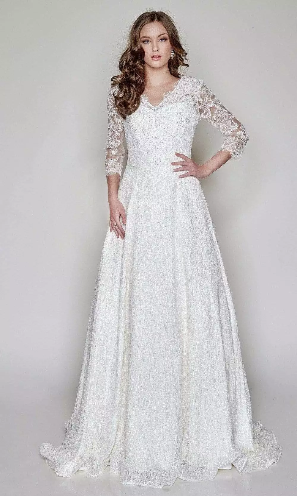 | Details: | Quarter sleeves, Embroidery, Beads, V back, Lace-up tie, Floor length, Sweep train |