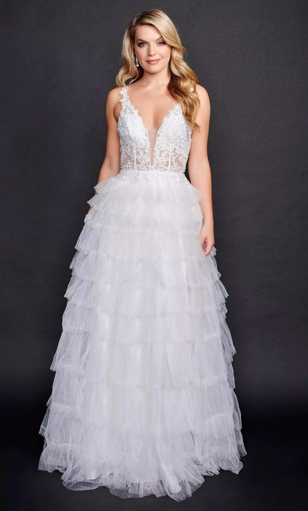 Soft and romantic in an exquisite head-to-toe lace wedding dress by Nina Canacci 3226. Shine with the glow of ever after in this mesmerizing gown with a bodice designed with lace appliqued with flowers. The back has an open look featuring spaghetti straps and a zipper for zipping. The skirt of this A-line gown gives exquisite vibes with its tiered style that extends down to the floor. Nina Canacci 3226 wedding dress evokes princess-inspired elegance in a soft and romantic silhouette. Model is wearing Ivory color.