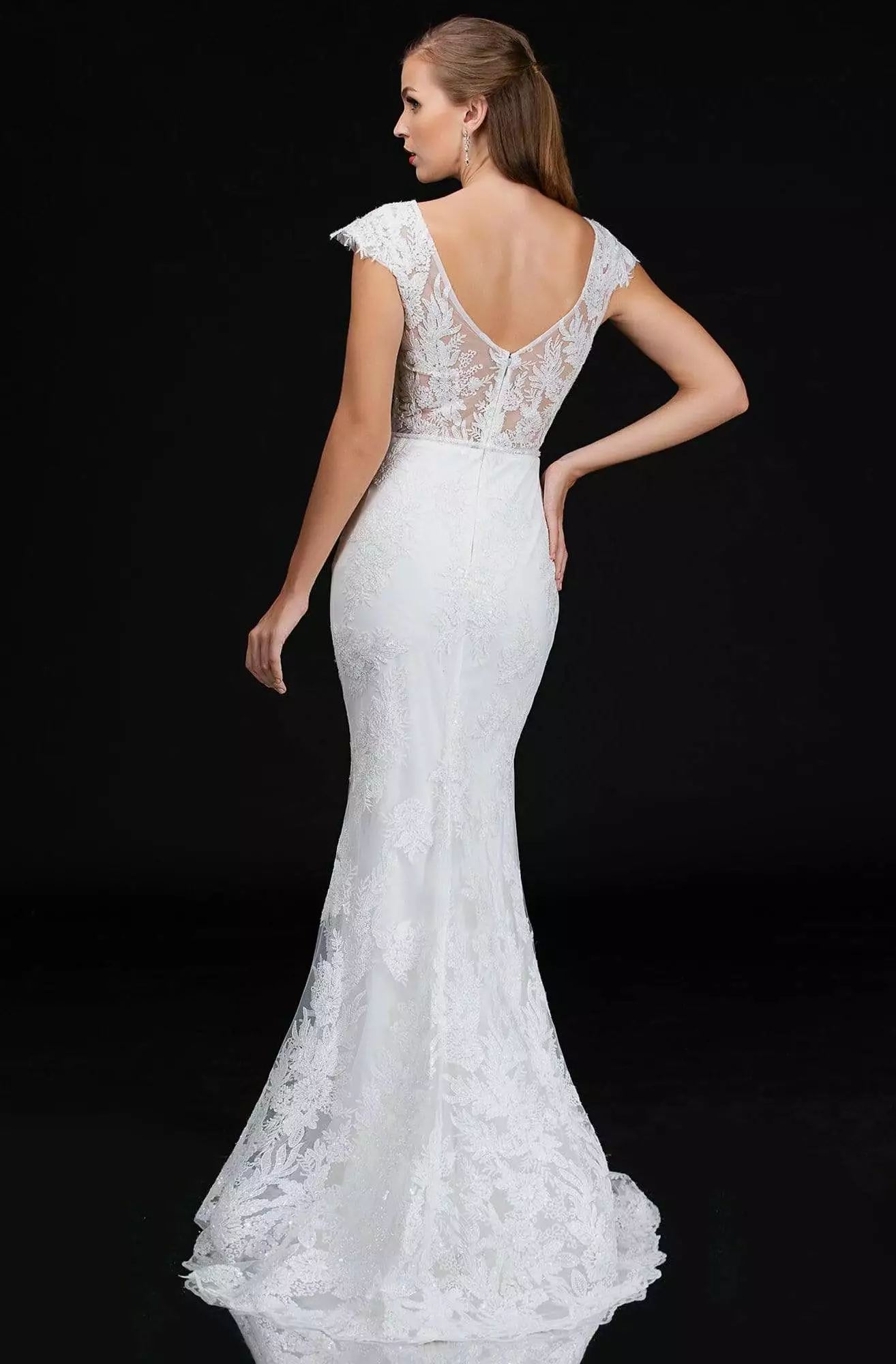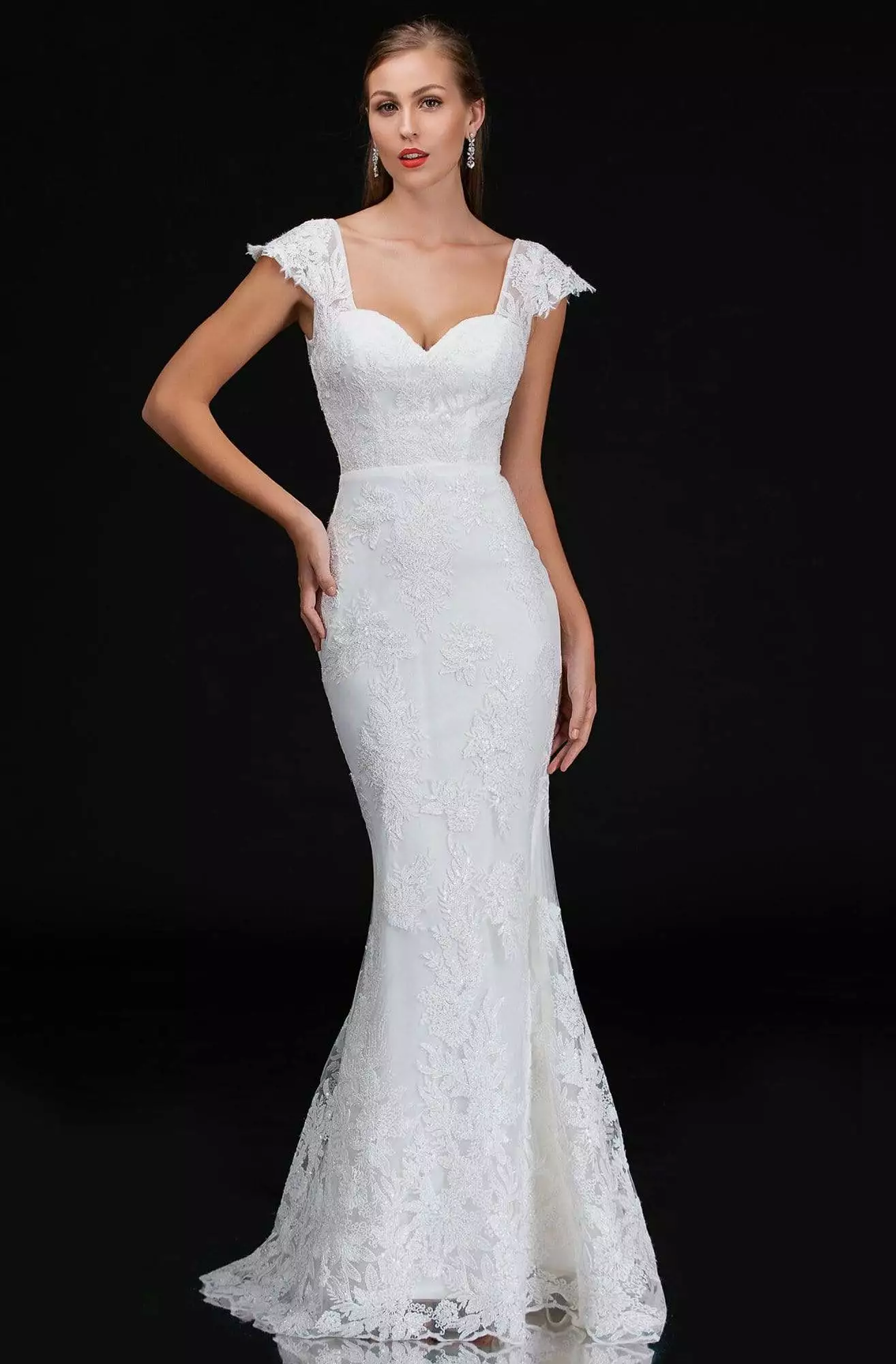 | Details: | Cap sleeves, Embroidery, Fitted bodice, Long trumpet dress, Low scoop back, Back zipper, Sweep train |
