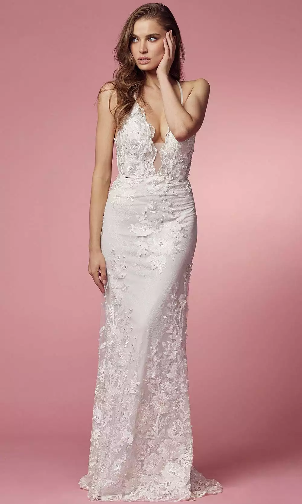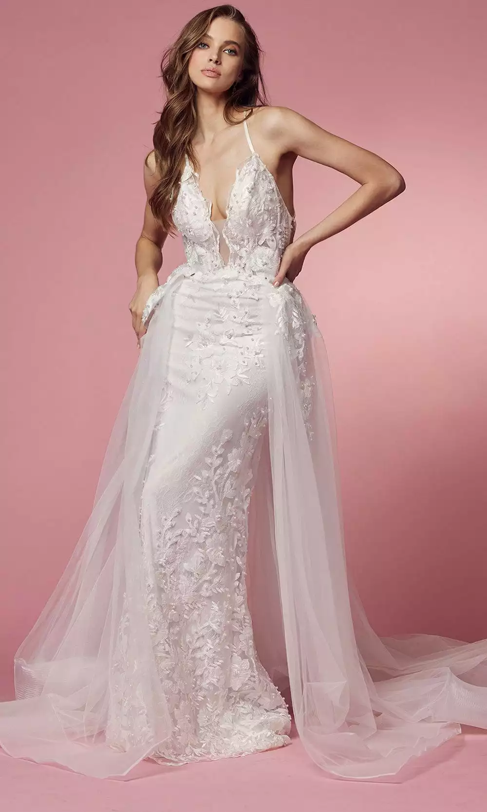 Be swept away by the romance of this Nox Anabel Bridal F485W creation on your wedding day. Detailed with lace embroidered details with a sprinkle of pearl beadwork, this spaghetti strap bridal gown features a plunging v-neckline with an illusion inset. Flimsy straps lace up on a backless styled accent, an embroidery detailed overskirt drapes the adorned sheath skirt as it ends on the floor with a subtle train. Flourish stunning elegance on your special day in this Nox Anabel Bridal masterpiece. This stunning collection of Nox Anabel dresses will reflect your personality and give you an elegant red-carpet look. Model is wearing the White color.