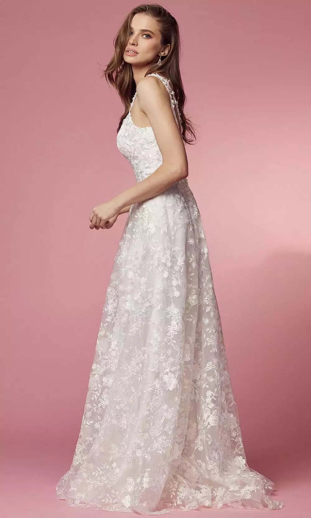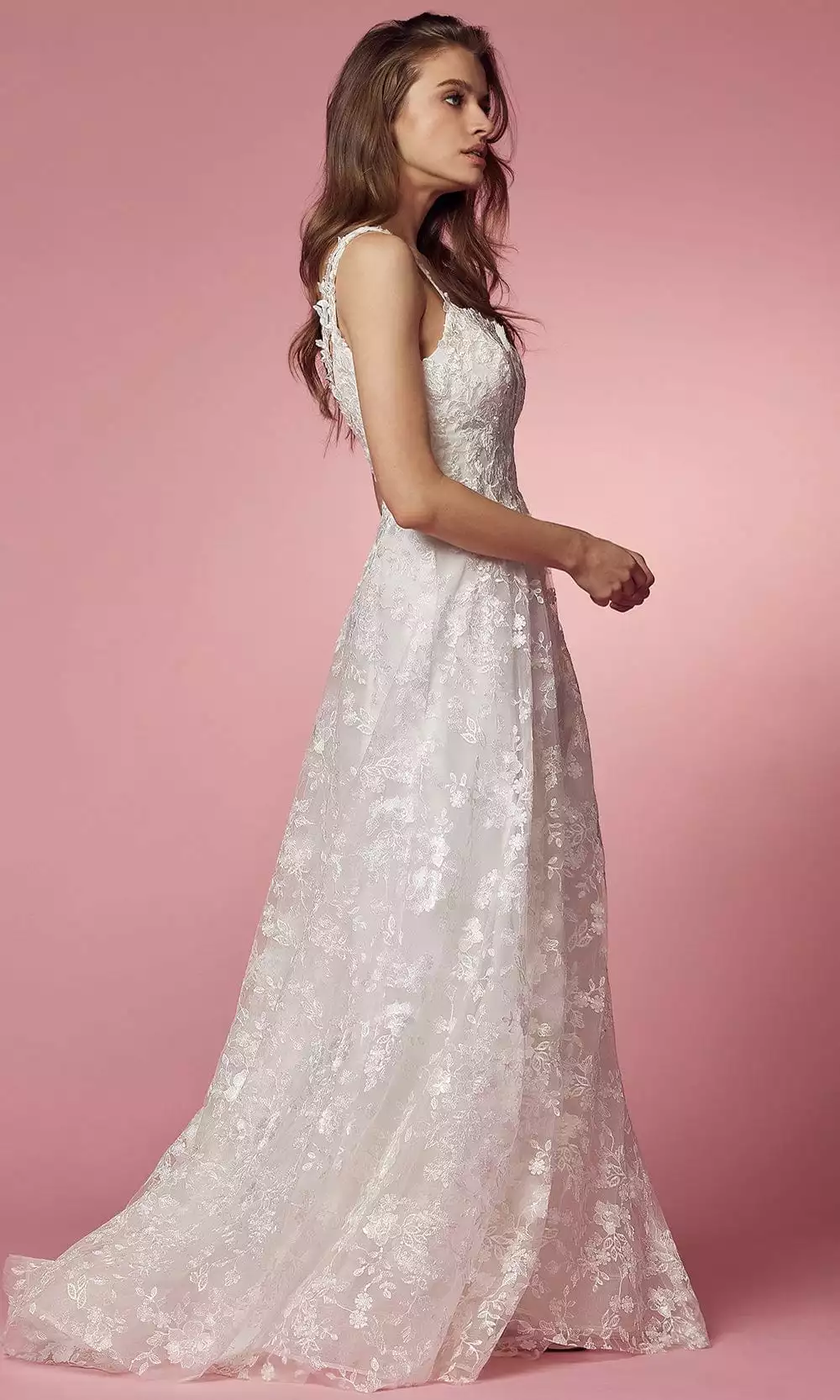 Turn yourself into a head-turning beauty by slipping into this absolutely eye-catching Nox Anabel Bridal JE922 design. This sleeveless gown is designed with floral embroidery throughout its length. It features a plunging sweetheart neckline and open back supported by wide straps. The back is accented with buttons and has a zipper closure. The skirt forms a full length A-line silhouette and finishes in a sweep train. This Nox Anabel Bridal creation is truly remarkable! This stunning collection of Nox Anabel dresses will reflect your personality and give you an elegant red-carpet look. Model is wearing White color.