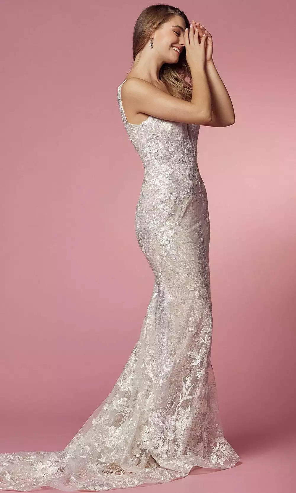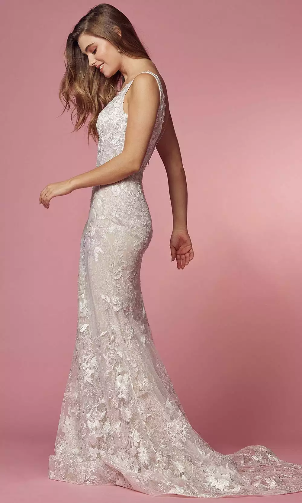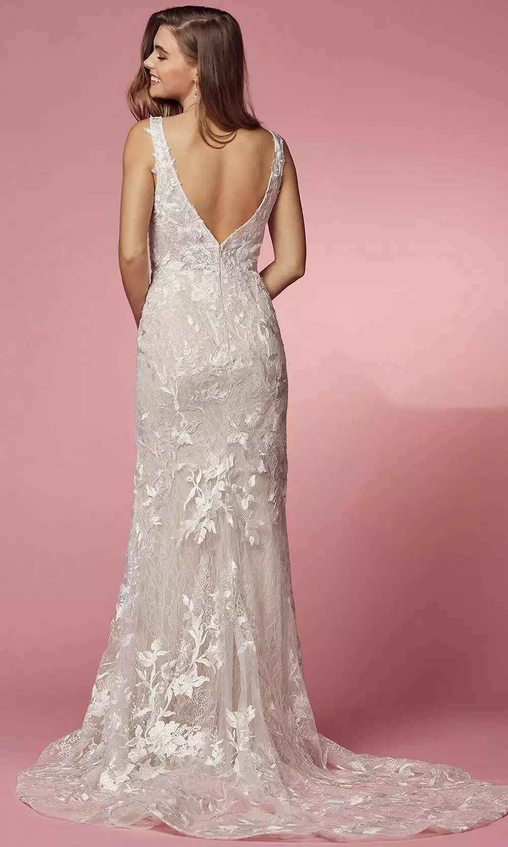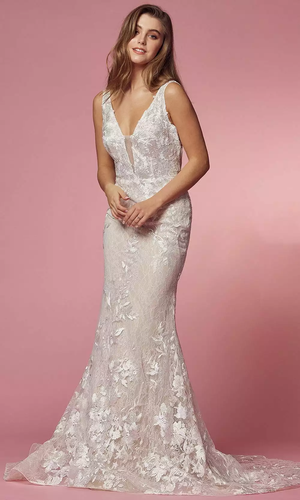 All eyes will be on you in this elegant bridal gown by Nox Anabel Bridal JW908. Displaying a fitted bodice, this gown features a sleeveless and plunging V-neckline with a low V-back. The whole ensemble is designed with gorgeous floral embroidery and the skirt runs a full length sheath silhouette, finished off with a court train. This Nox Anabel Bridal creation will sure to display your natural beauty and grace. This stunning collection of Nox Anabel dresses will reflect your personality and give you an elegant red-carpet look. Model is wearing the White/Nude color.