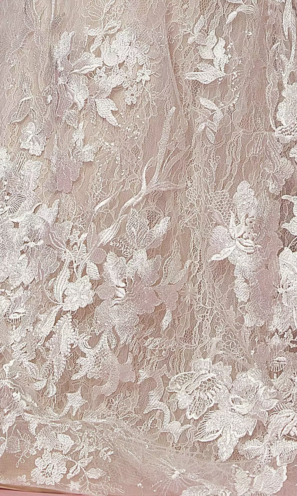 | Details: | Sleeveless, Wide Straps, Sheer Inset, Lace, Floral Embroidery, V-Back, Back Zipper, Court Train |