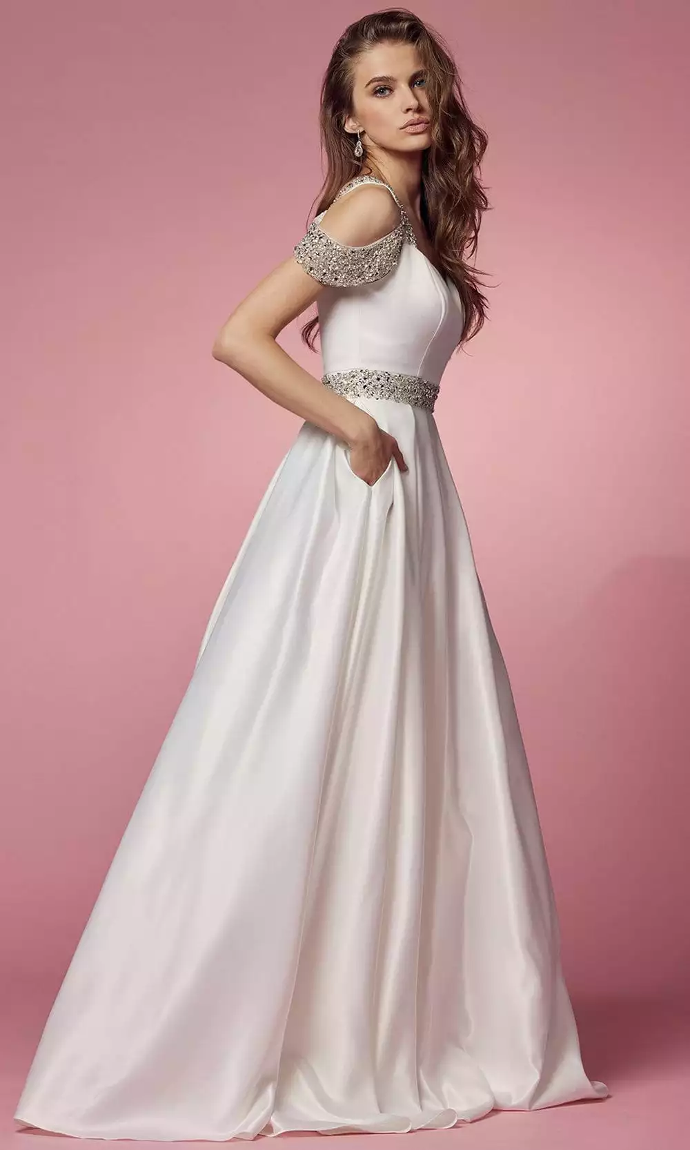 Get noticed in any crowd wearing this Nox Anabel Bridal R224W creation. This elegant gown showcases a sweetheart neckline with beaded embellished cold shoulders strap and waistband. The open back has a zipper closure while the skirt reveals a pleated detail and flows into a full length A-line silhouette. You’ll be envied in an unbeatable gown from Nox Anabel Bridal. This stunning collection of Nox Anabel dresses will reflect your personality and give you an elegant red-carpet look. Model is wearing White color.
