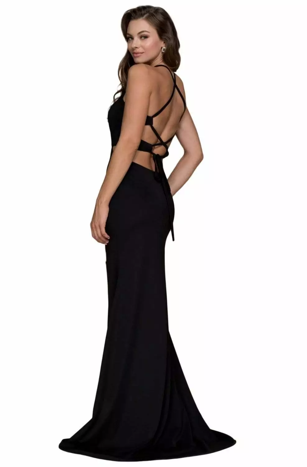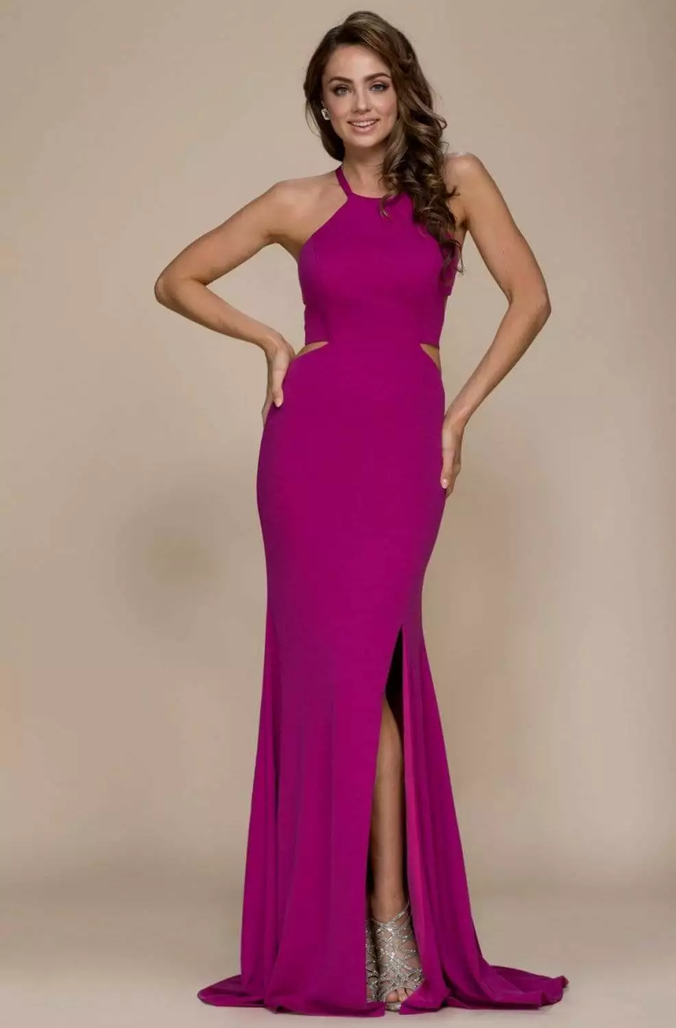 Inspire awe as you live the dream of a romantic night in this Nox Anabel C026 evening gown. The dress is crafted in soft jersey fabric with an elegant matte finish, featured with a high-halter neckline, fitted bodice and sexy side panel cutouts with lace-up tie support from the open back. The sheath skirt reveals a high leg slit as it flows towards the floor in full length hem with sweep train. Bring a breathtaking new look to the red carpet in this stunning Nox Anabel creation.