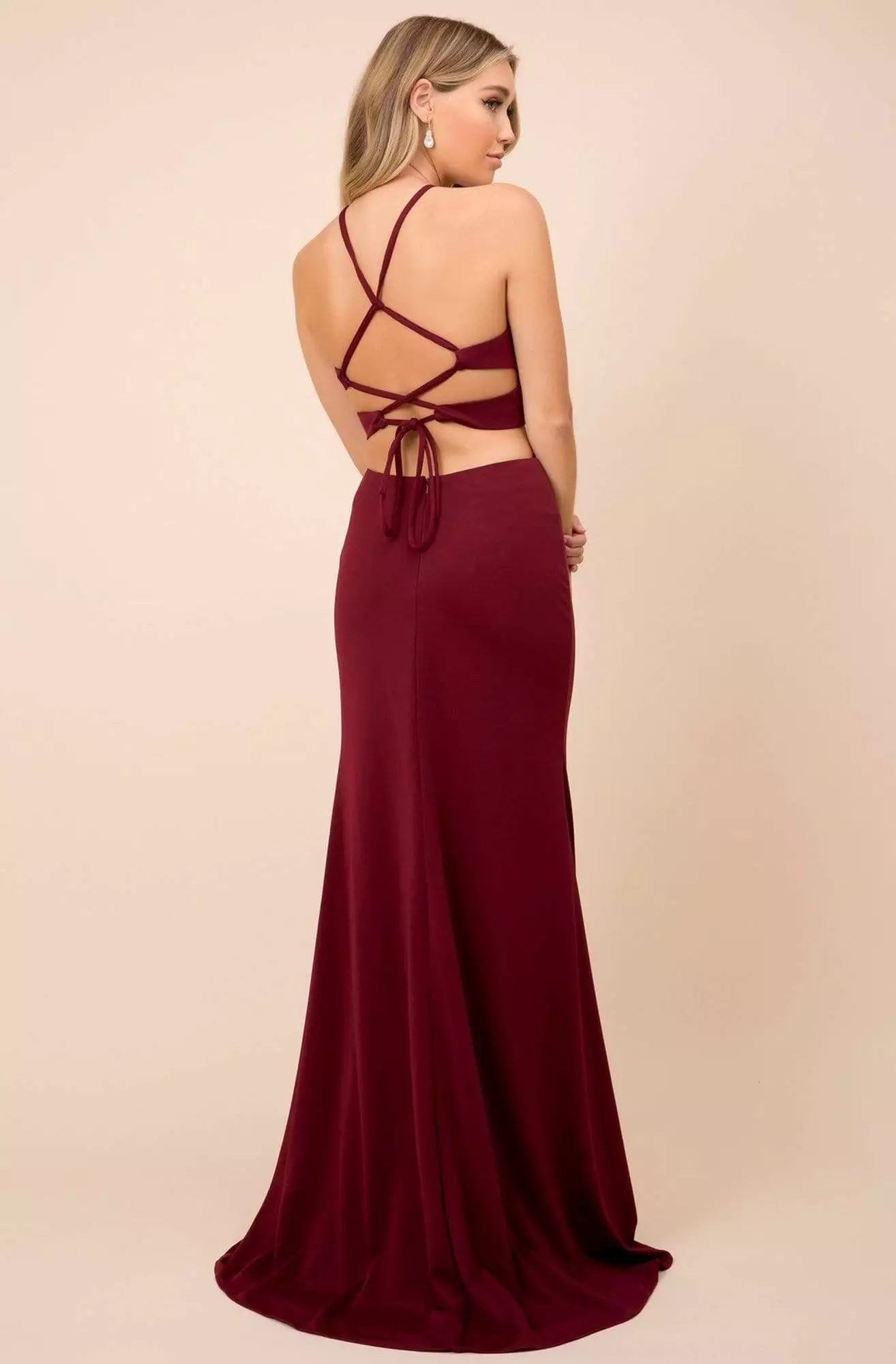 | Details: | Jersey fabric, 100% Polyester, Sleeveless, Slender straps, Cut-out side panel, Open back, Lace-up tie back with zipper closure, Left leg slit, Sweep train |