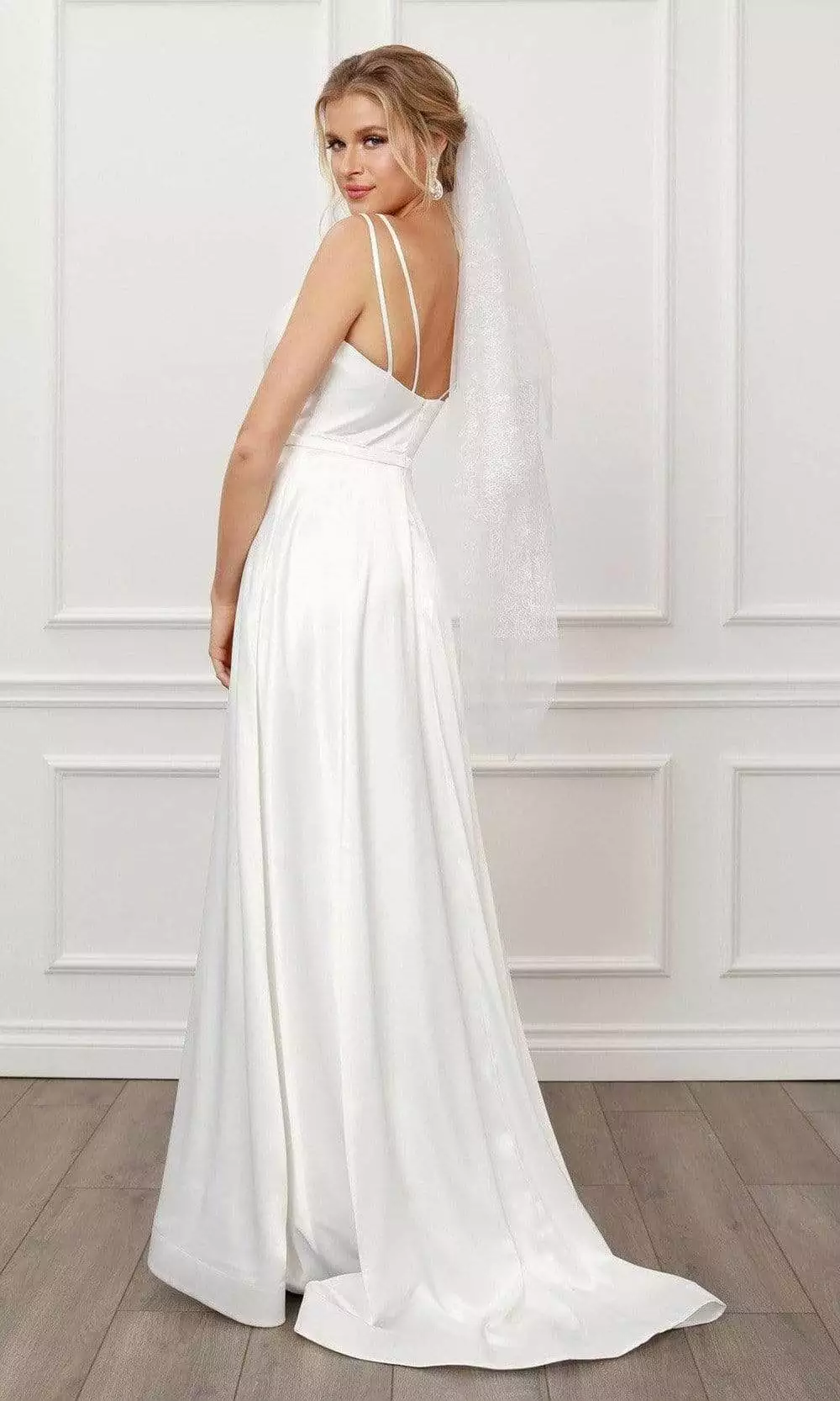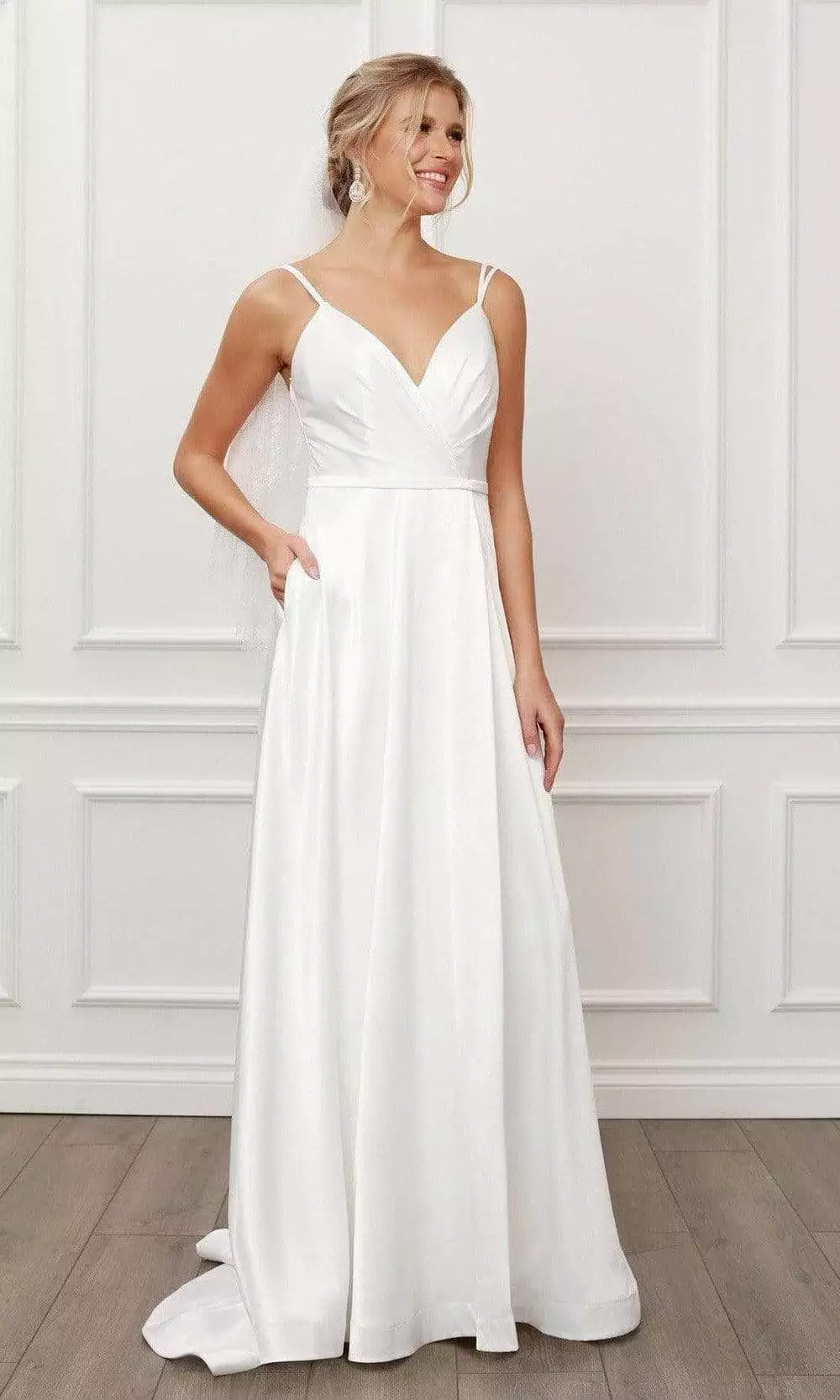 Display your natural beauty and grace in this lovely Nox Anabel E484 masterpiece. This elegant cross v neck double straps a-line gown fashions a sleeveless fitted bodice with a cross V neckline sitting on the empire waist leading a fitted midriff with varying lengths over the waist for a vine-like effect. The bodice is held by double spaghetti straps leading to the strappy lace-up with low v back with center zipper up. The flattering silhouette of the dress cascades down your every curve, with a full A-line that flares at the knee and is finished with a horsehair ribbon hemline. Have a blast in this fashionable Nox Anabel dress.