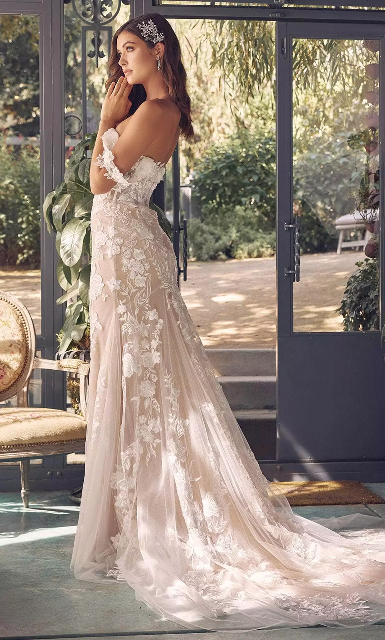 Elegant and alluring, this sophisticated piece from Nox Anabel JE974 is ready to shine at your most awaited wedding day. With its semi-sweetheart bodice accented with an off-shoulder sleeves, you can show your sophisticated sense of style while looking sassy and stunning. This is dress is also made to be extra elegant with its floral embroideries corded in a fully-lined tulle, adorning the whole dress from the bodice down to the draping sheath-silhouette skirt with a flowy chapel train. This Nox Anabel JE974 is the perfect match for the bride who wants to look both sexy and fashion-forward. Model is wearing White & Nude color.