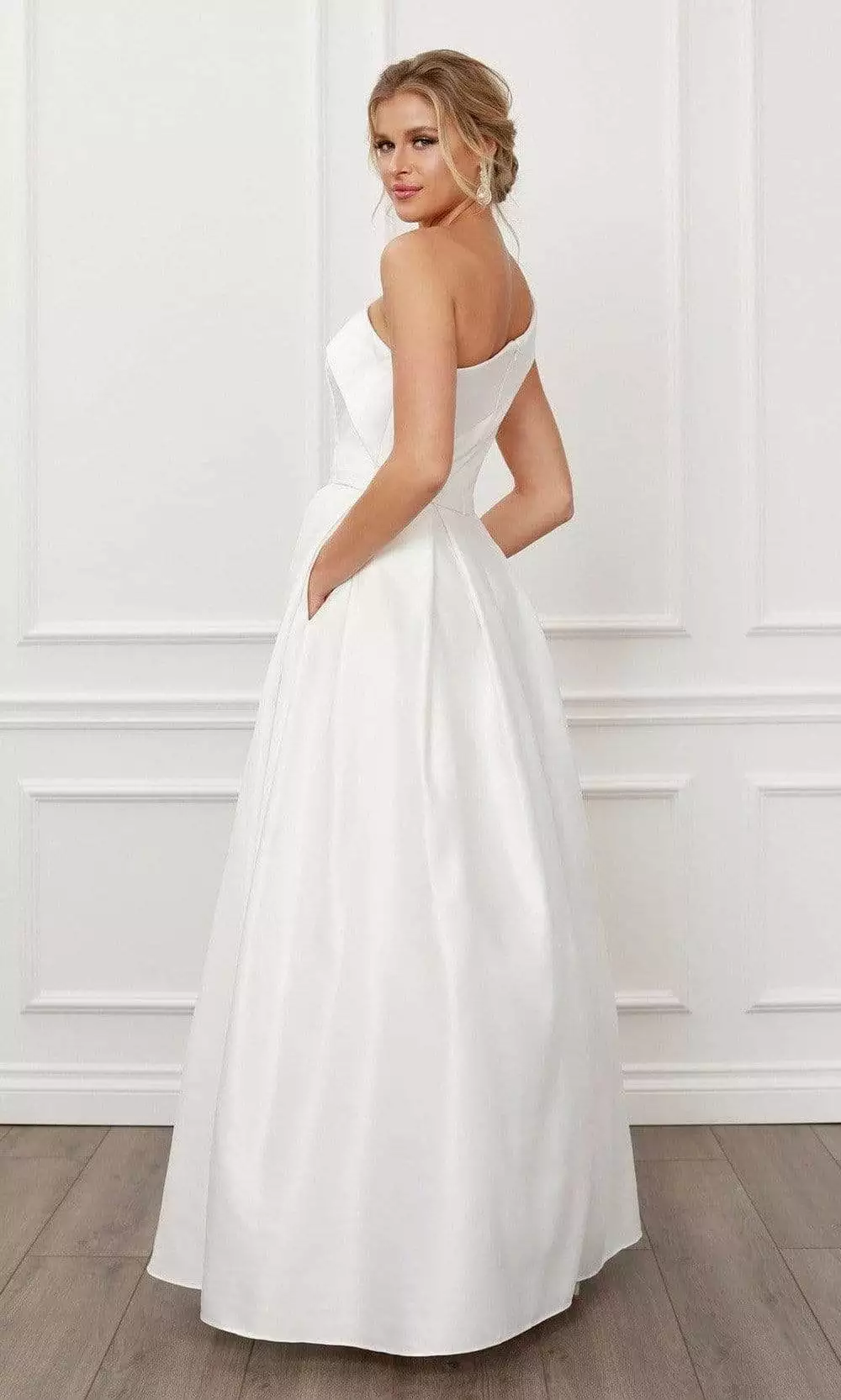 Look absolutely gorgeous in this Nox Anabel E469. One-shoulder satin dress showcases full-length vibrant satin A-line gown and a beautiful sculpturing look. The one-shoulder neckline and tailor seam fitted body hinting at just enough skin for a tasteful touch of sexiness. The back mirrors the same one-shoulder style with a center zipper closure. The A-line skirt billows magnificently down to an impeccable full-length hem finishing off with a subtle train, a final touch of tradition.