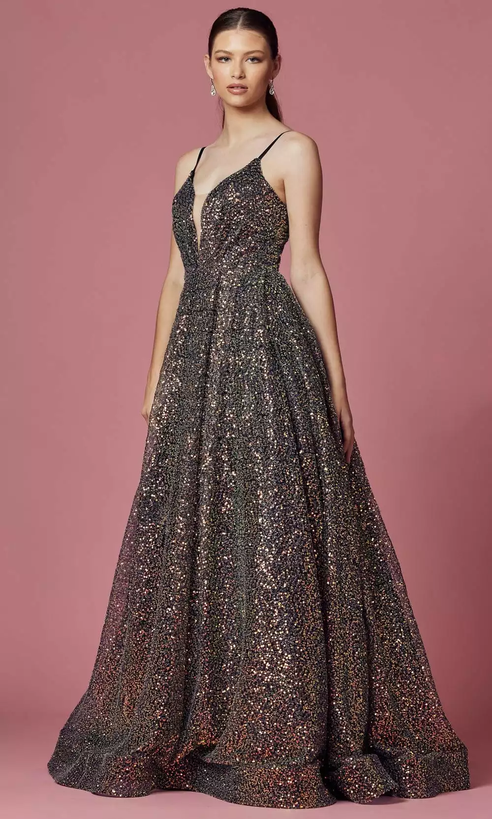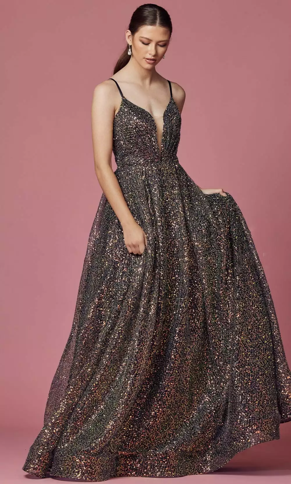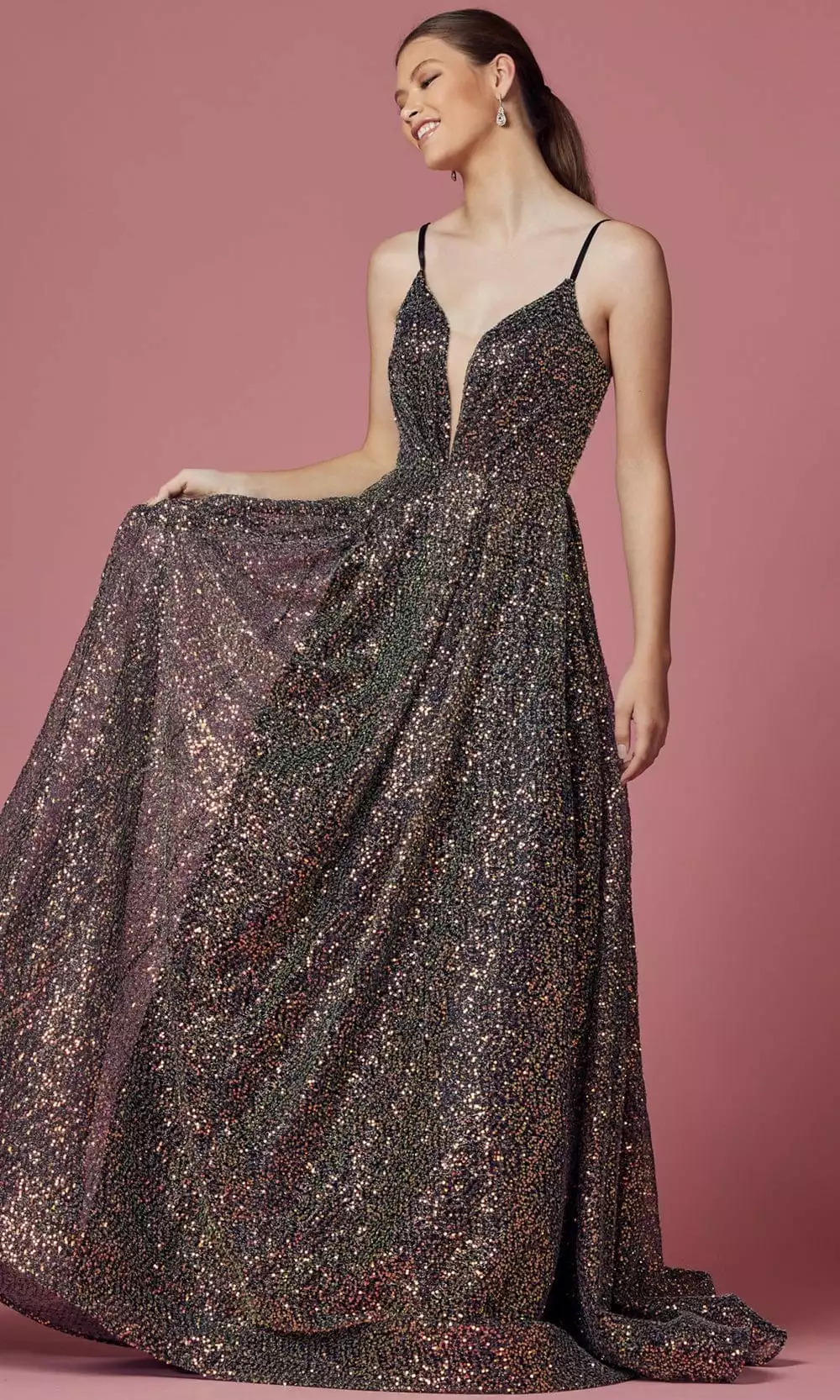 Orchestrate a spectacular evening of dazzling sophistication in this luxurious Nox Anabel R1030 evening gown. Exquisitely designed with sparkling sequins, this piece flaunts a plunging V-neckline and mid-open back supported with adjustable spaghetti straps. The pleated skirt reveals a full length A-line silhouette and ends with a sweep train. This Nox Anabel masterpiece is sure to create a striking look that is sure to make anyone remember your grand entrance. This stunning collection of Nox Anabel dresses will reflect your personality and give you an elegant red-carpet look. Model is wearing Black/Multi color.