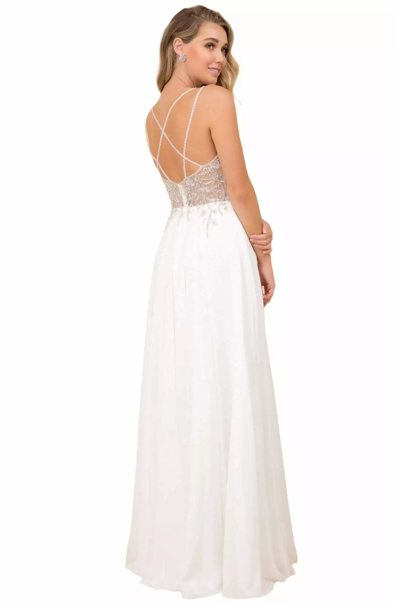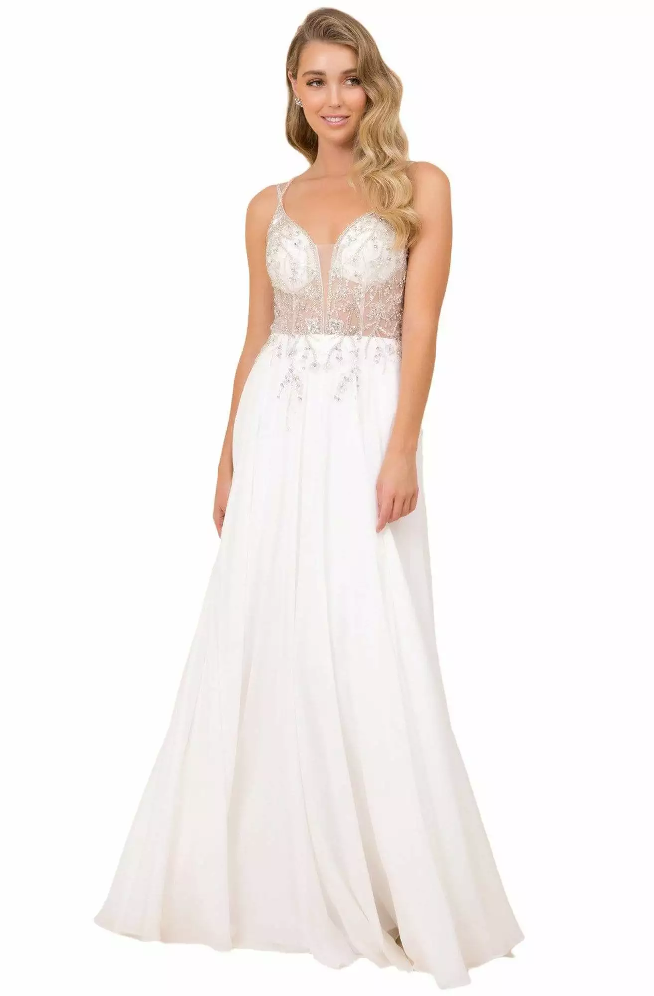 Get ready to be captured in picture of sophistication in this beautiful Nox Anabel T315 evening dress. The illusion bodice is designed in intricate bead embellishments with a plunging sweetheart neckline and sheer inset detail at the bust. Beaded dual straps support the bodice as it leads to the mid-open zipped up back. Soft pleats design the a-line skirt as it strikingly cascades to a full length hemline. This evening gown by Nox Anabel design is a red carpet knockout. Find more wedding dresses!