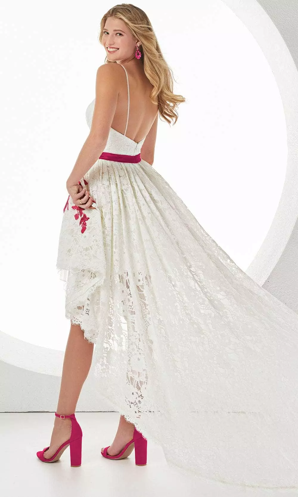 Flaunt a style that is exquisitely feminine in this Panoply 14087 creation. Embellished with sequined lace appliques trailing the bodice, this spaghetti strap stunner features a plunging sweetheart neckline with a sheer inset. Thin straps connect to a mid-open back as a detachable bow accents the front bodice. The A-line skirt flares into a high low hemline. Lavish in the classic style of this Panoply masterpiece.