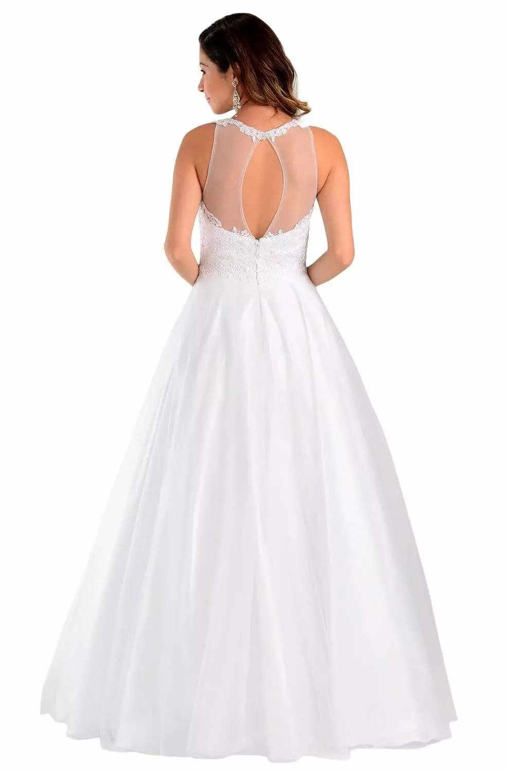 Take their breath away with this stunning gown by Poly USA 7490. This elegant tulle gown appeals in a sleeveless, halter neckline with fitted bodice designed with lace appliques. The back has a keyhole and a zipper closure. From the waist flourishes a full length A-line skirt. This Poly USA creation is simply captivating!