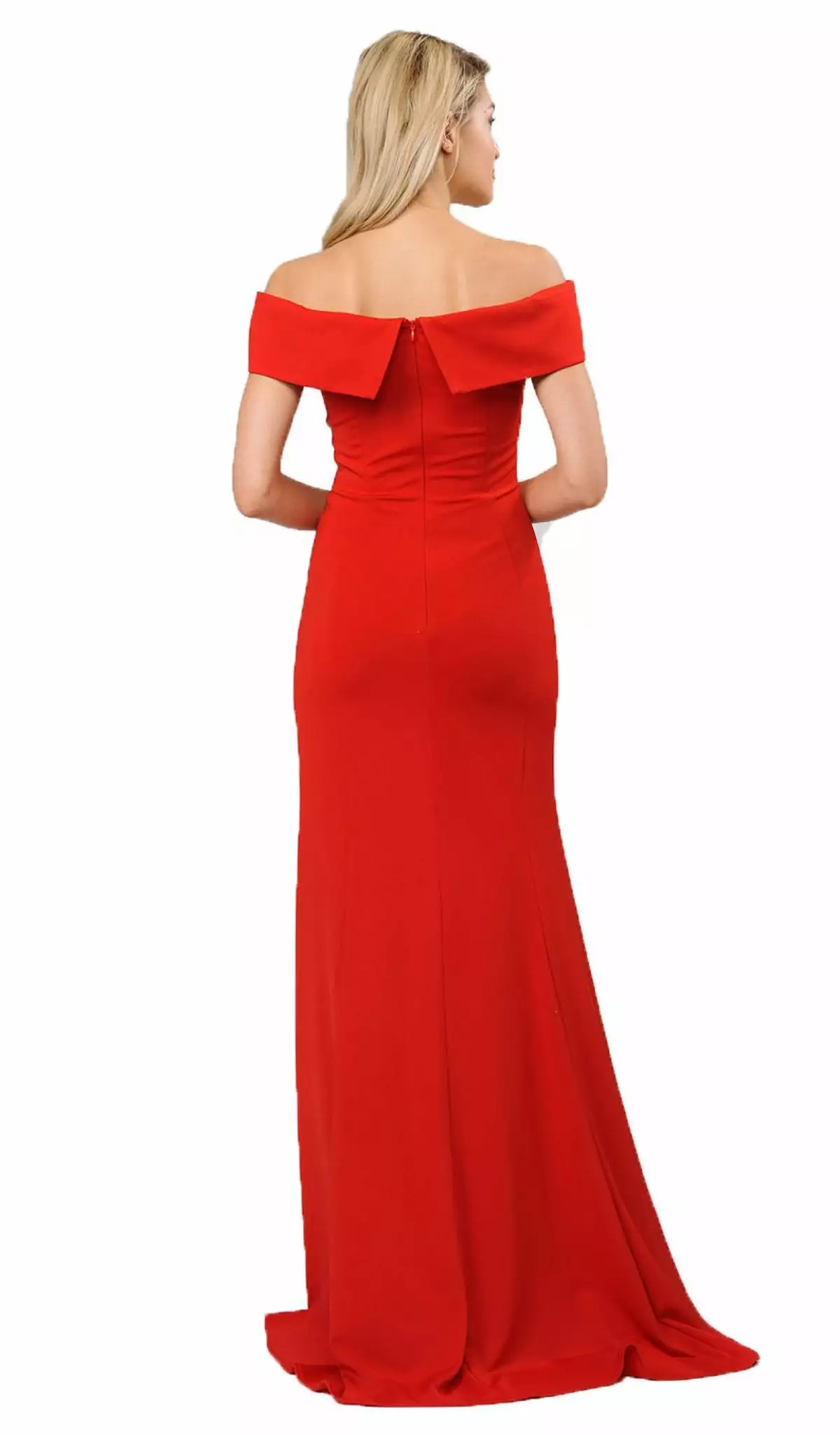 Make it a night to remember with this off-the-shoulder evening gown from Poly USA 8258. A mermaid silhouette Jersey gown, with a flattering overlapping folded off shoulder neckline and seam lined fitted bodice . The dress allures with its front slit and floor length finish with back train. This Poly USA creation is a stunning outfit for prom, red carpet events, awards night or any other social gatherings. Comes in many different color, model is wearing the dress in Red.