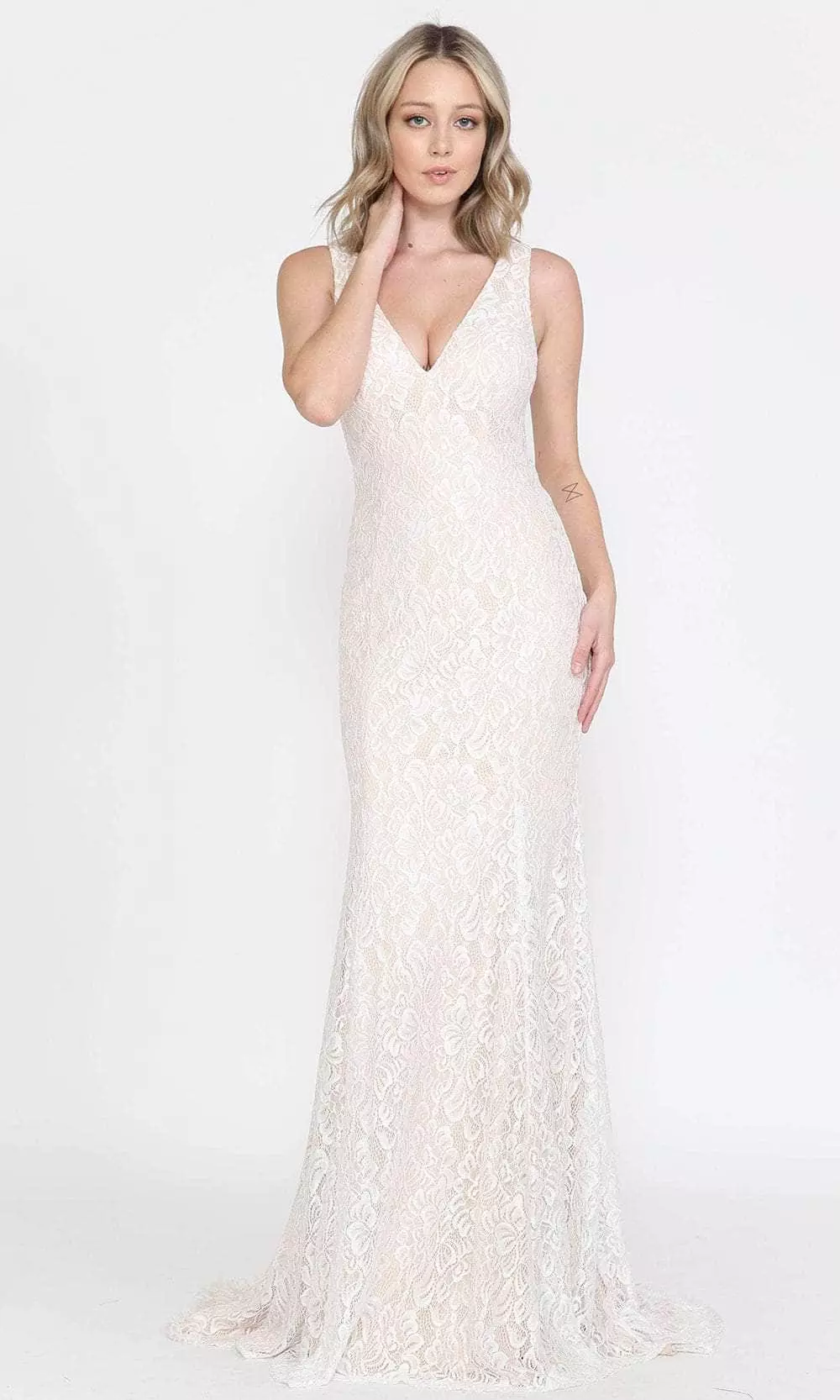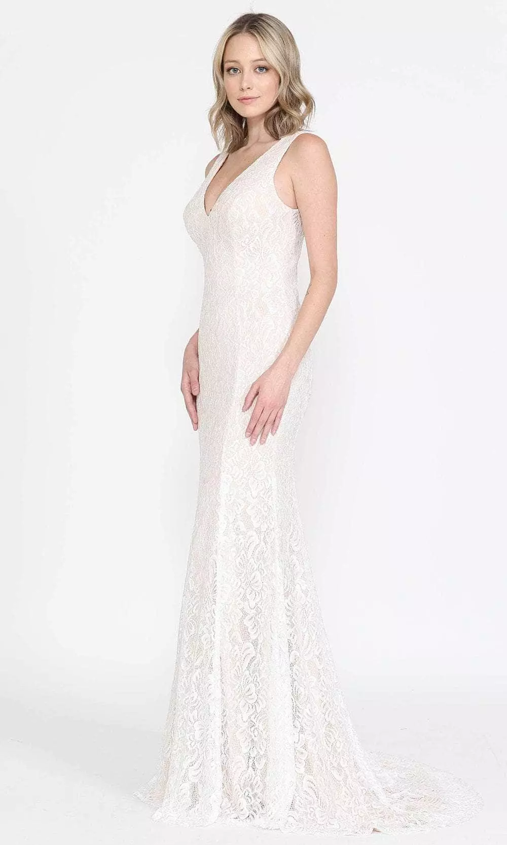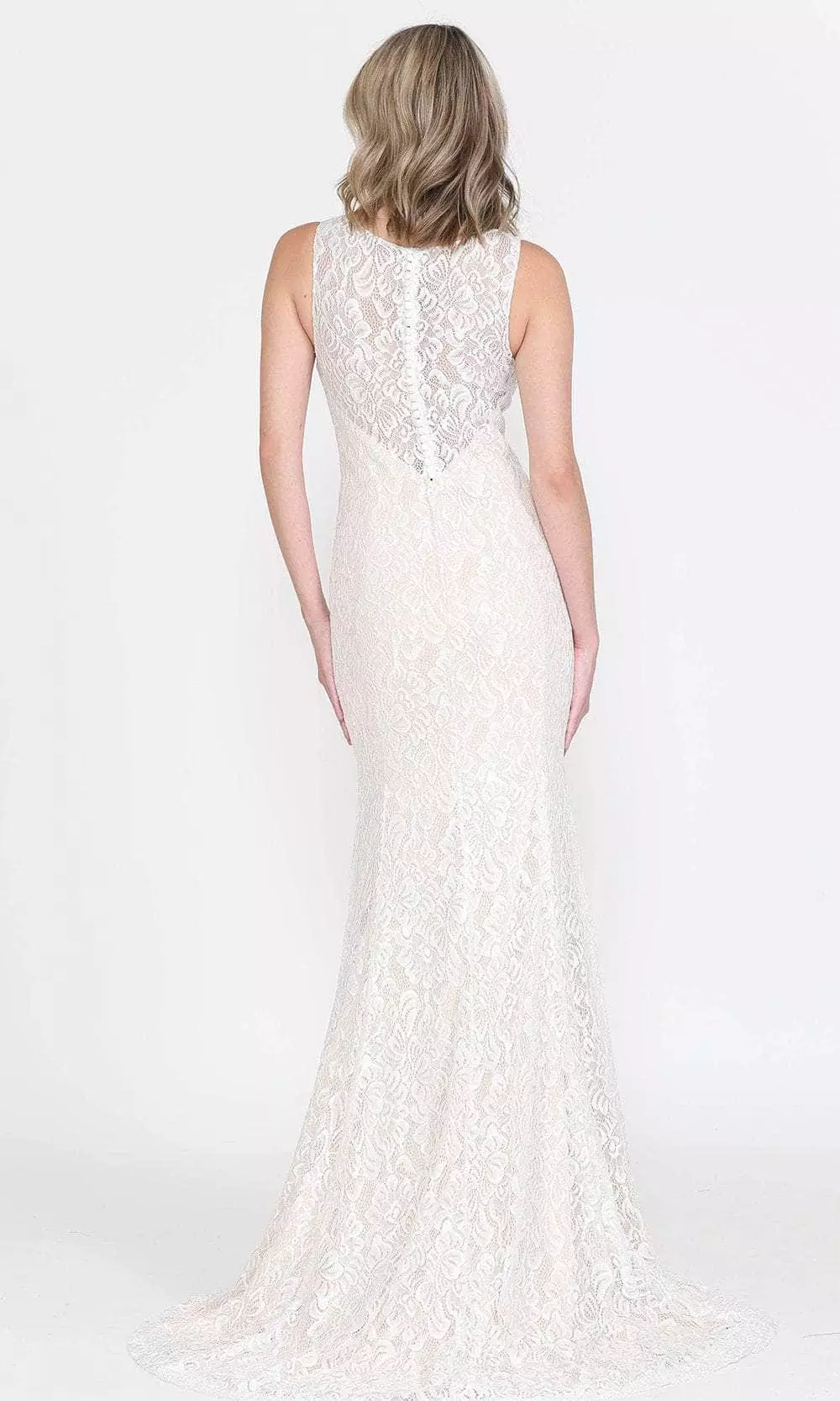 Captivate your man in this ethereal gown from Poly USA 8496. This lace lovely gown features a V-neckline with a sleeveless frame. The dress has a flattering fitted bodice that will surely turn heads. It has a fully enclosed back secured with buttons and a back zipper closure. The skirt forms a full-length sheath silhouette and finishes in a sweeping train. Shine with sophistication in this stunning Poly USA 8496. Model is wearing Off-White Nude color.