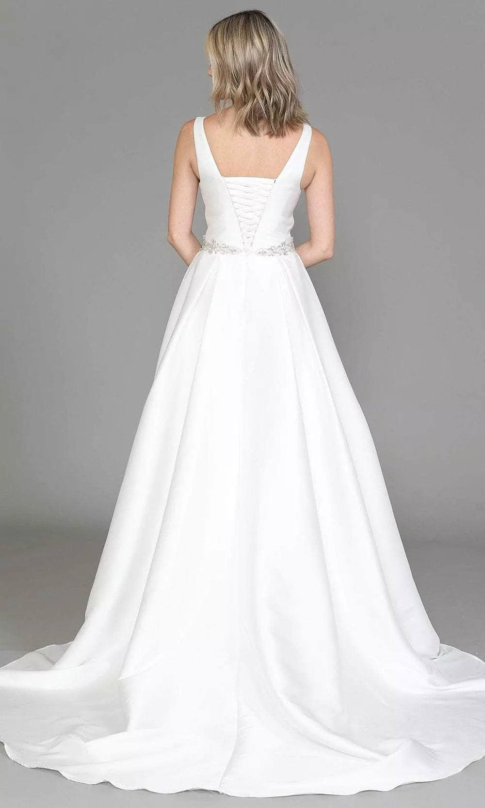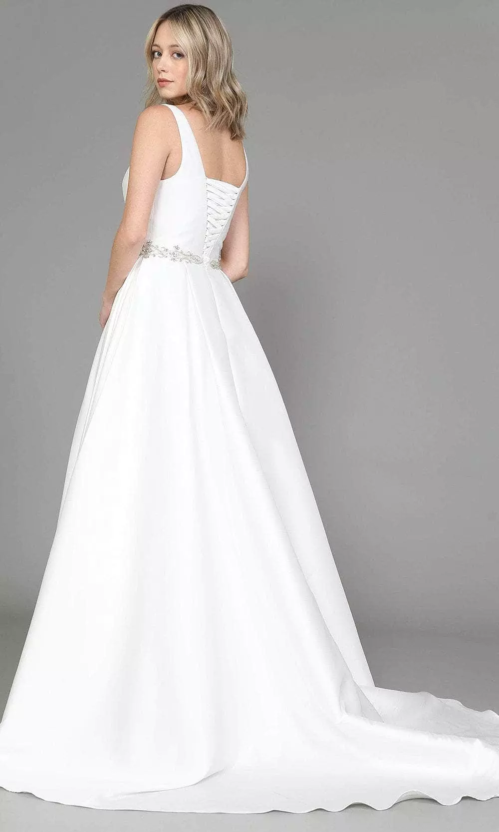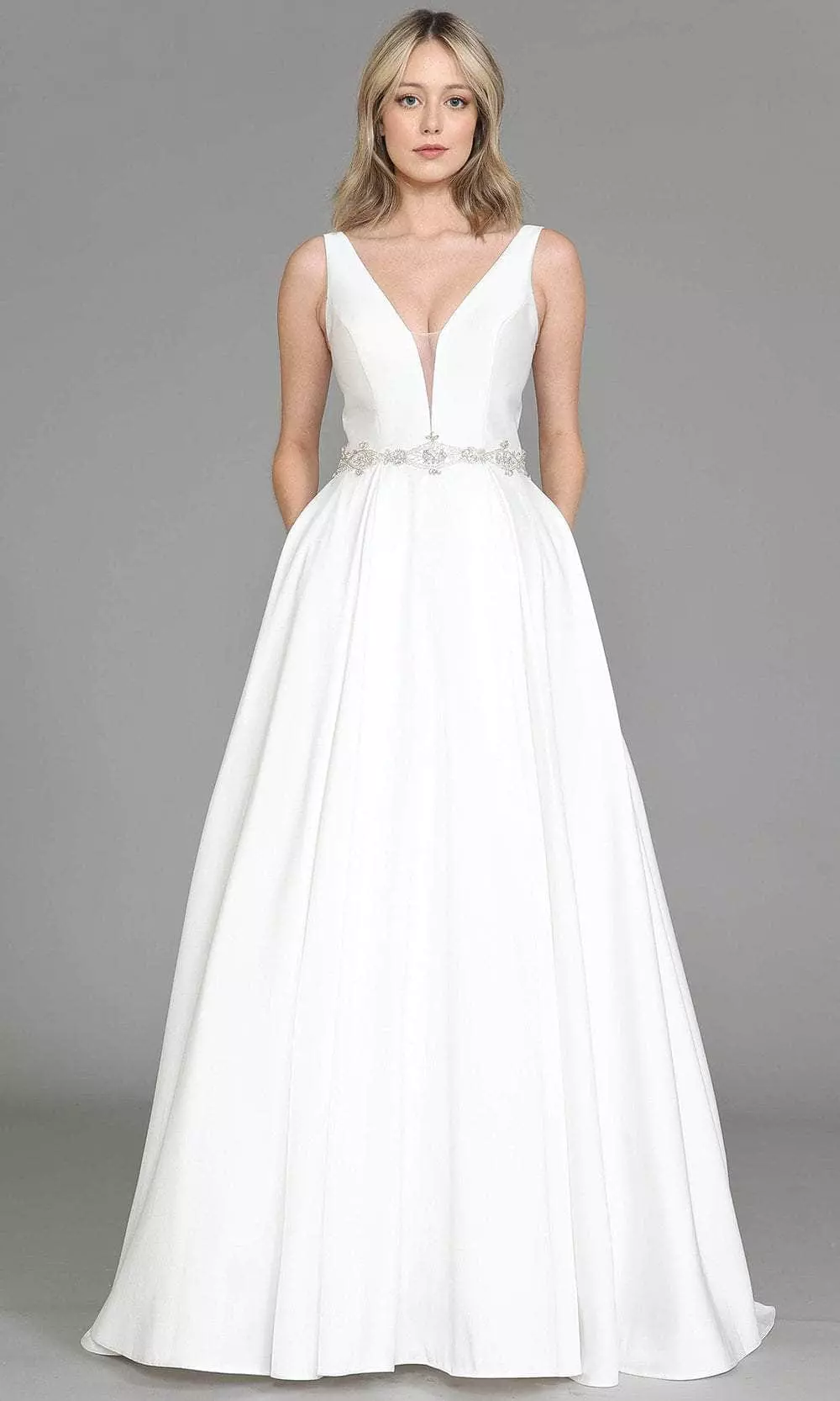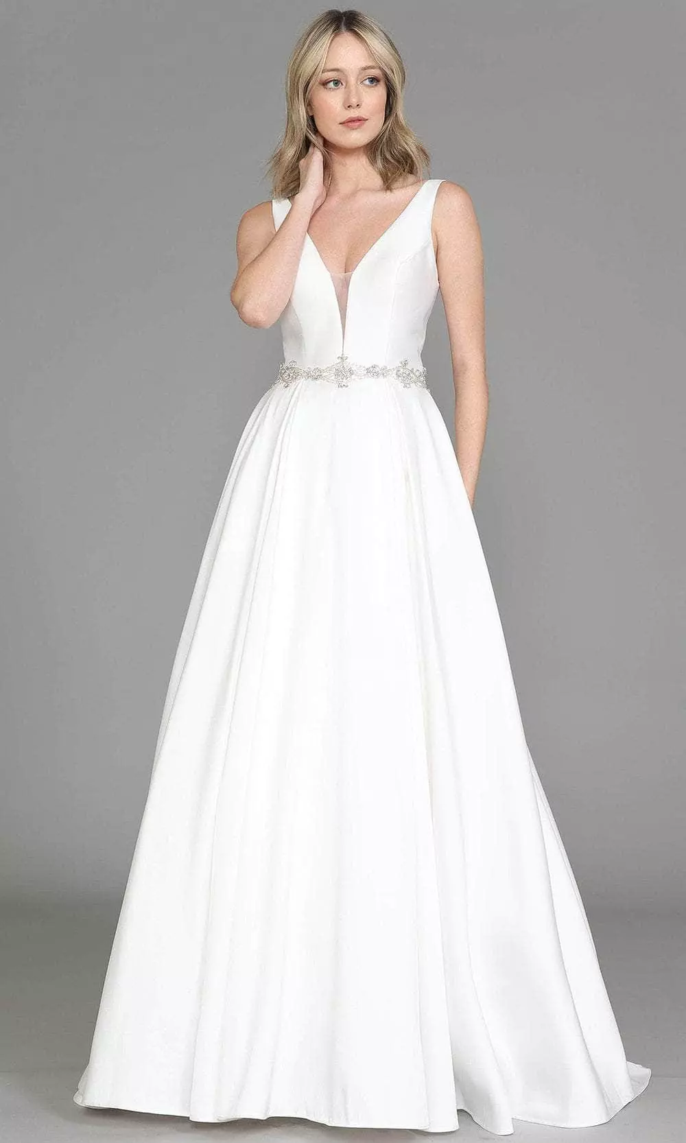 Embody sophistication and glamour in this lovely gown from Poly USA 8498 creation. Characterized by an enticing low-cut V-neckline that is complemented by a figure-hugging bodice that is crafted with clean seams and is accented with a mid-open back secured with corset closure. Crowned with a jeweled waistline, the skirt flares into an A-line design with a court train. Compel everyone to take a gander at you in this inspired Poly USA 8498. Model is wearing Off-White color.