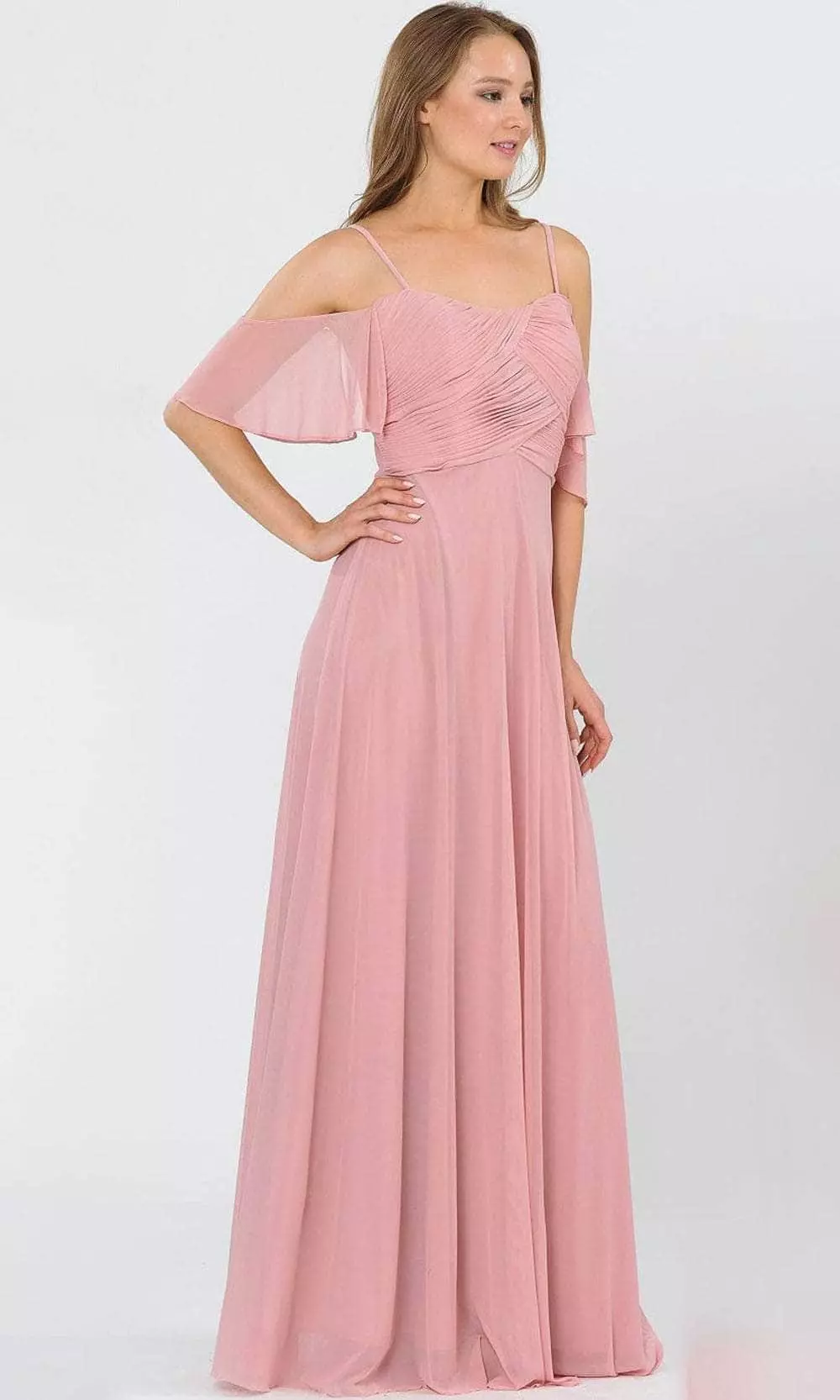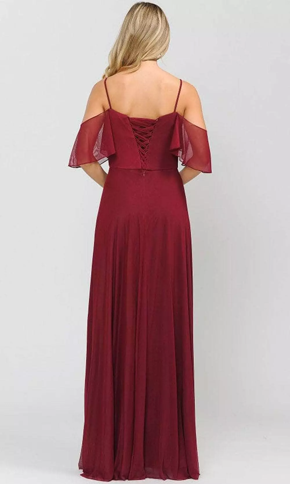 Celebrate a dreamy sophistication that shows a feminine flair in this Poly USA 8552W creation. Softly made in a delicate fabric that shows fine ruching along the bodice, this stunner shows off a dainty sheer off-shoulder semi-sweetheart neckline on a surplice design. It has a mid-open back with lace-up tie and a zipper closure. The sheath skirt flutters beautifully into a floor-length hemline. All eyes will be on you in this picture-perfect Poly USA masterpiece. Poly USA dresses are for every girl who wants to flaunt her unique style and has an eye for fashion. This assortment of special occasion dresses is breathtakingly beautiful that is sure to slay the crowd at any event. The models are wearig Burgundy, Royal, Mauve and Yellow colors.