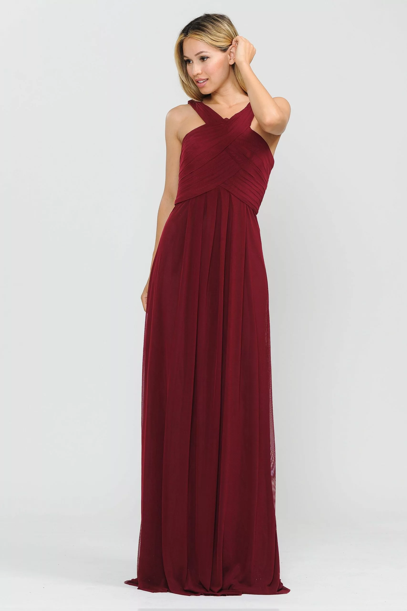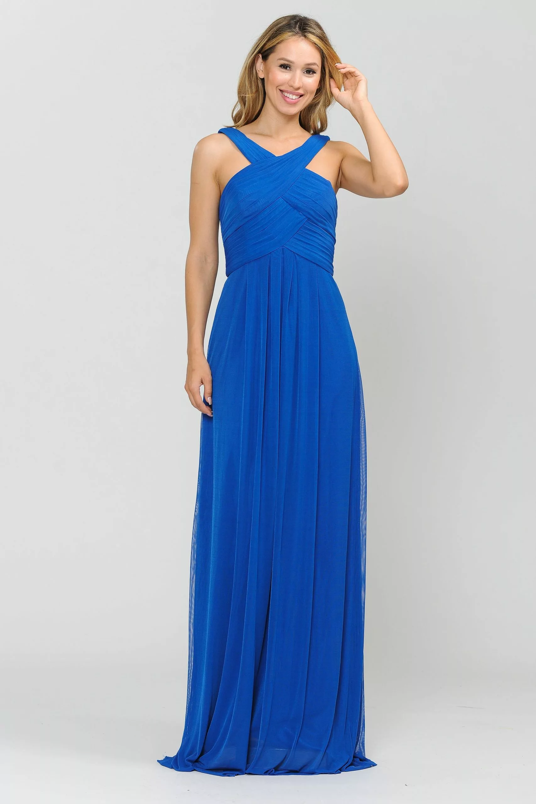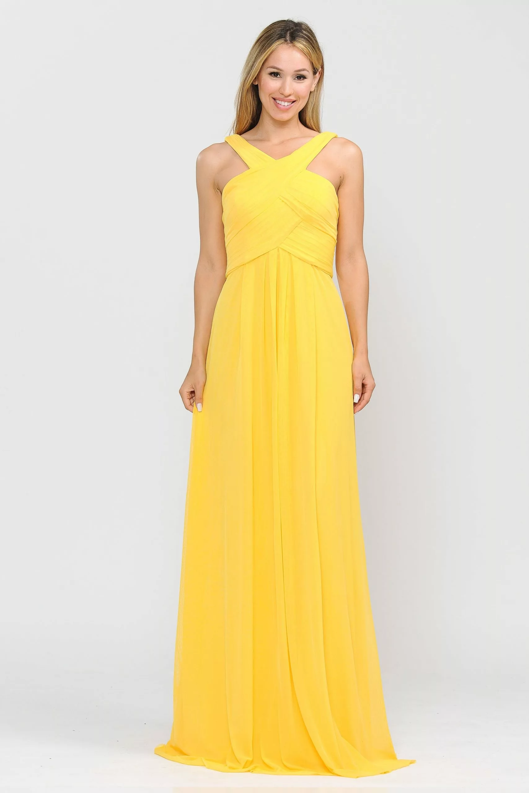 Uphold an attention grabbing style in this in this stylish Poly USA 8554 creation. This gorgeous formal gown features a graceful bandage pleated bodice with a V-neck and crisscrossed straps leading to an open back. The skirt has an A-line silhouette and a sweep train at the back. Floor so captivating in this exquisitely titillating Poly USA masterpiece. Poly USA dresses are for every girl who wants to flaunt her unique style and has an eye for fashion. This assortment of special occasion dresses is breathtakingly beautiful that is sure to slay the crowd at any event. Model is wearing Yellow, Royal Blue, Burgundy, and Mauve colors.